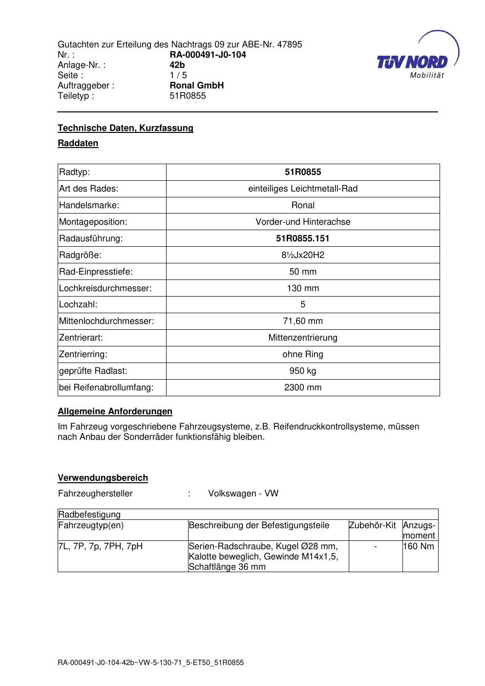 Dieses Gutachten (abe) bezieht sich auf die Alufelge Ronal 51R0855 in der Ausführung 9.5Jx2 ET 0, Mittenloch 0 mm (KBA 47895). Im PDF findest du typischerweise zulässige Reifengrößen, Auflagen/Anbauhinweise und – je nach Dokument – Hinweise zur Eintragung.