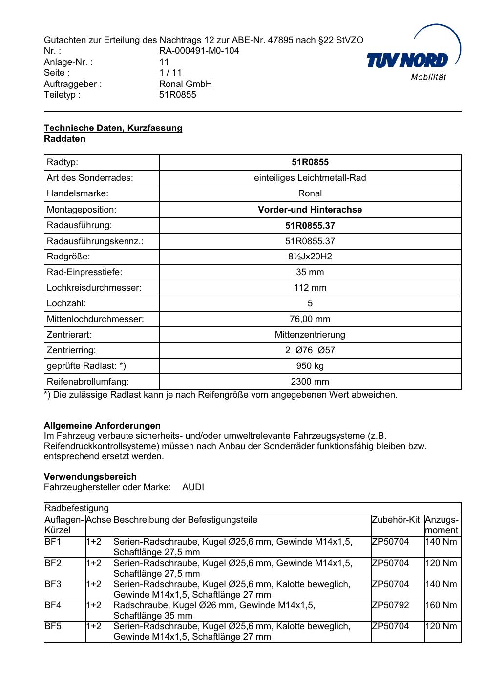 Dieses Gutachten (abe) bezieht sich auf die Alufelge Ronal 51R0855 in der Ausführung 9Jx2 ET 0, Mittenloch 0 mm (KBA 47895). Im PDF findest du typischerweise zulässige Reifengrößen, Auflagen/Anbauhinweise und – je nach Dokument – Hinweise zur Eintragung.