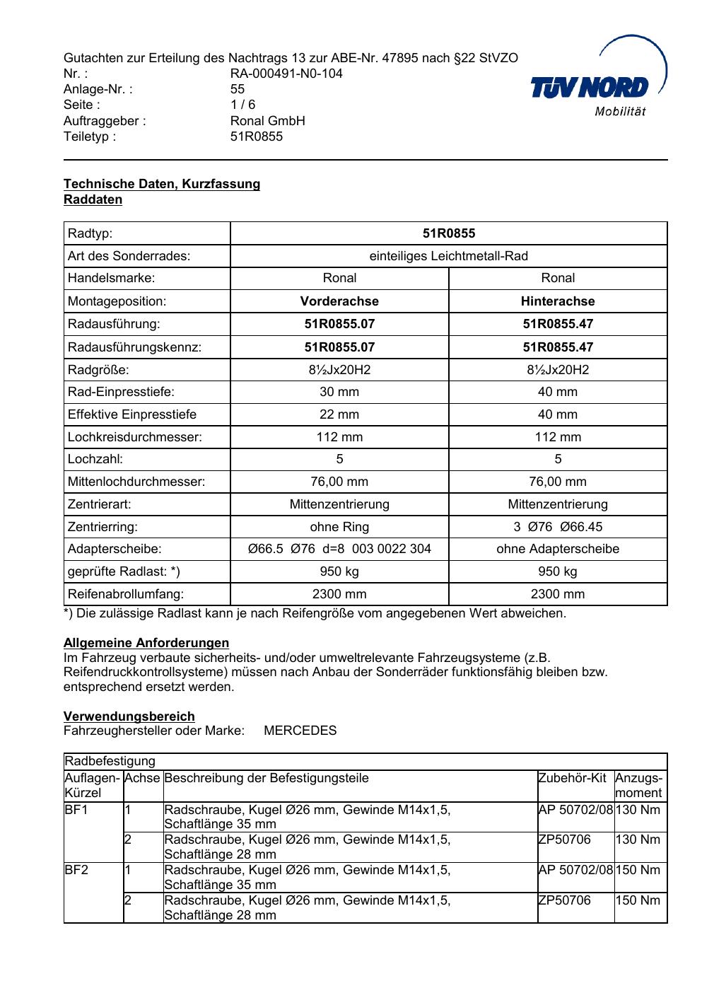 Dieses Gutachten (abe) bezieht sich auf die Alufelge Ronal 51R0855 in der Ausführung ET 0, Mittenloch 0 mm (KBA 47895). Im PDF findest du typischerweise zulässige Reifengrößen, Auflagen/Anbauhinweise und – je nach Dokument – Hinweise zur Eintragung.