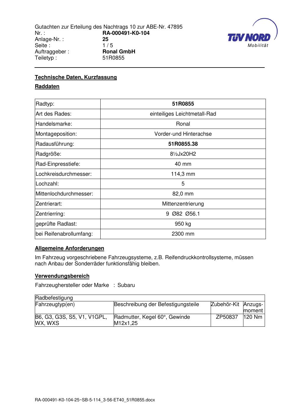 Dieses Gutachten (abe) bezieht sich auf die Alufelge Ronal 51R0855 in der Ausführung ET 0, Mittenloch 0 mm (KBA 47895). Im PDF findest du typischerweise zulässige Reifengrößen, Auflagen/Anbauhinweise und – je nach Dokument – Hinweise zur Eintragung.