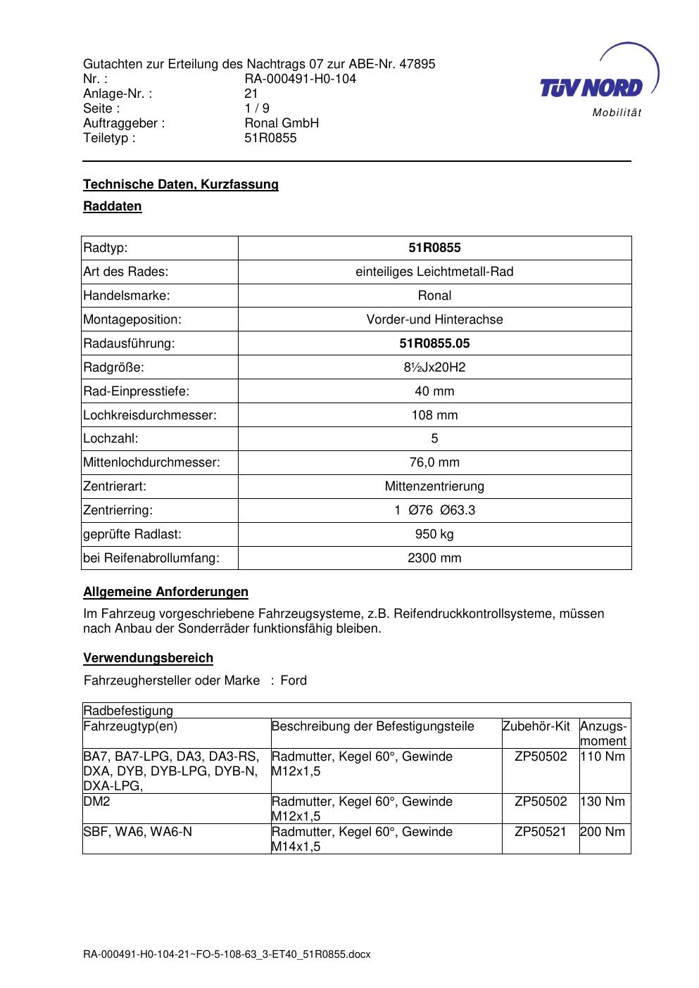 Dieses Gutachten (abe) bezieht sich auf die Alufelge Ronal 51R0855 in der Ausführung ET 0, Mittenloch 0 mm (KBA 47895). Im PDF findest du typischerweise zulässige Reifengrößen, Auflagen/Anbauhinweise und – je nach Dokument – Hinweise zur Eintragung.