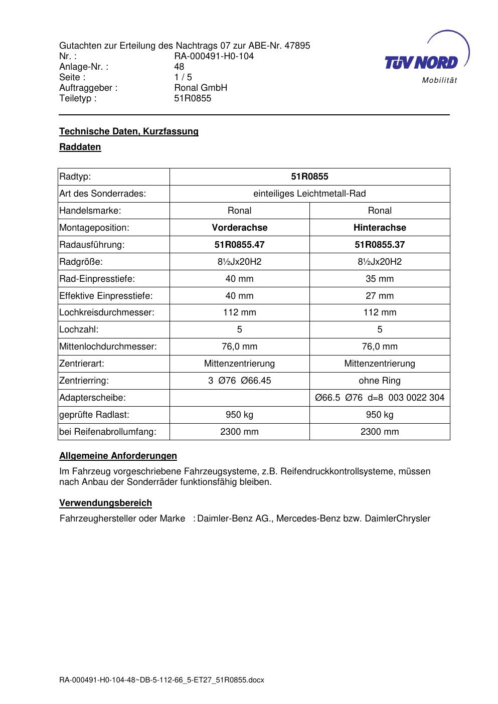 Dieses Gutachten (abe) bezieht sich auf die Alufelge Ronal 51R0855 in der Ausführung 8.5Jx2 ET 0, Mittenloch 0 mm (KBA 47895). Im PDF findest du typischerweise zulässige Reifengrößen, Auflagen/Anbauhinweise und – je nach Dokument – Hinweise zur Eintragung.