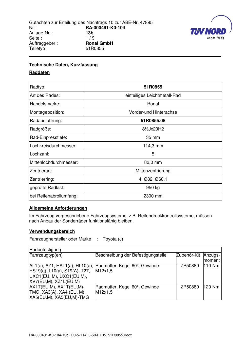 Dieses Gutachten (abe) bezieht sich auf die Alufelge Ronal 51R0855 in der Ausführung ET 0, Mittenloch 0 mm (KBA 47895). Im PDF findest du typischerweise zulässige Reifengrößen, Auflagen/Anbauhinweise und – je nach Dokument – Hinweise zur Eintragung.