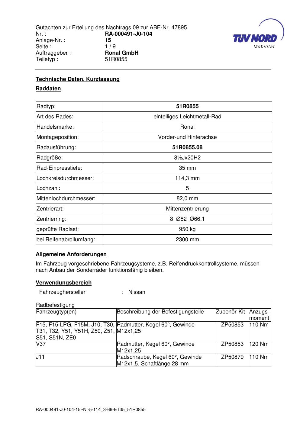 Dieses Gutachten (abe) bezieht sich auf die Alufelge Ronal 51R0855 in der Ausführung ET 0, Mittenloch 0 mm (KBA 47895). Im PDF findest du typischerweise zulässige Reifengrößen, Auflagen/Anbauhinweise und – je nach Dokument – Hinweise zur Eintragung.