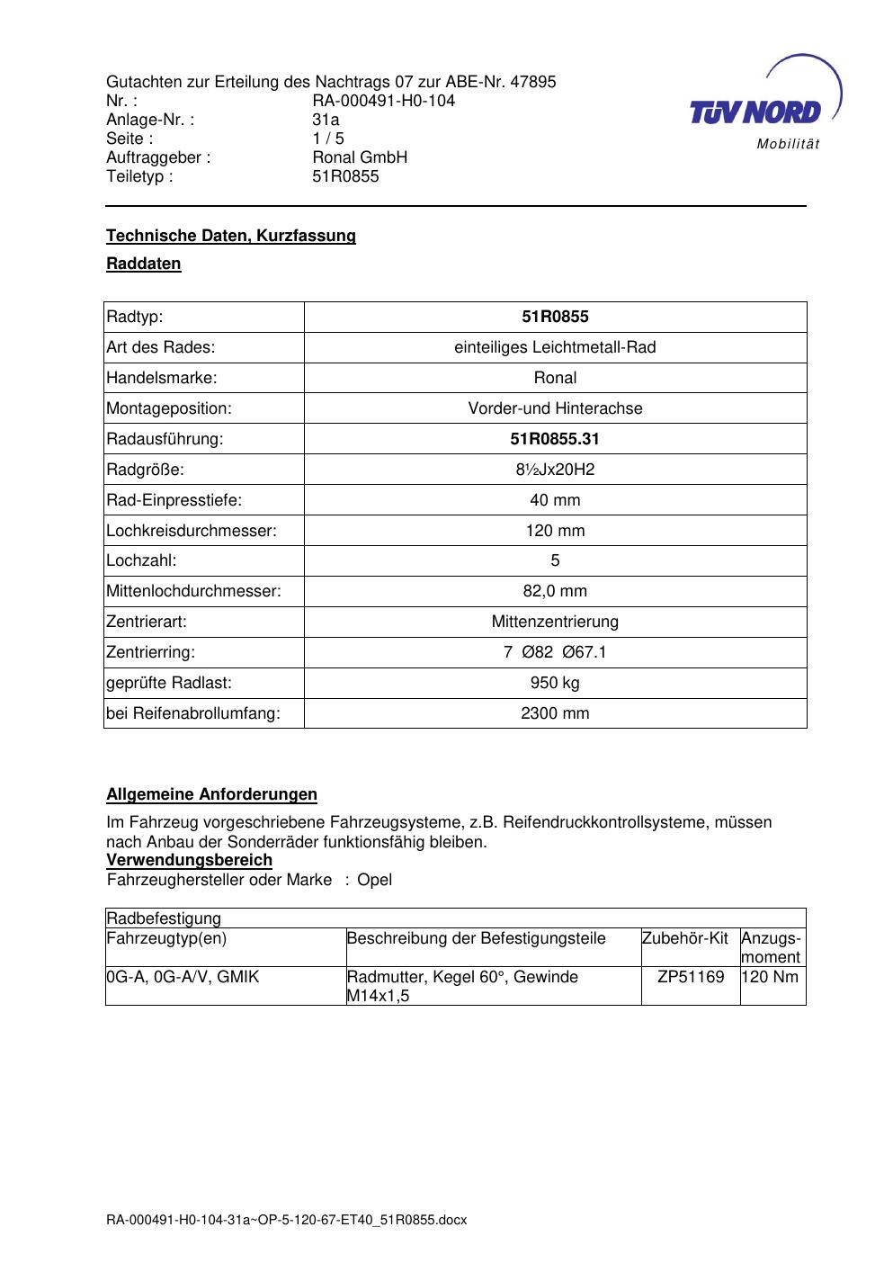 Dieses Gutachten (abe) bezieht sich auf die Alufelge Ronal 51R0855 in der Ausführung ET 0, Mittenloch 0 mm (KBA 47895). Im PDF findest du typischerweise zulässige Reifengrößen, Auflagen/Anbauhinweise und – je nach Dokument – Hinweise zur Eintragung.