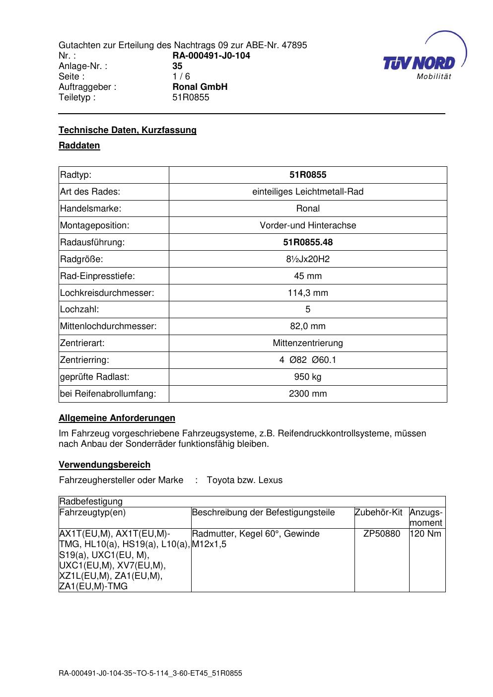 Dieses Gutachten (abe) bezieht sich auf die Alufelge Ronal 51R0855 in der Ausführung ET 0, Mittenloch 0 mm (KBA 47895). Im PDF findest du typischerweise zulässige Reifengrößen, Auflagen/Anbauhinweise und – je nach Dokument – Hinweise zur Eintragung.