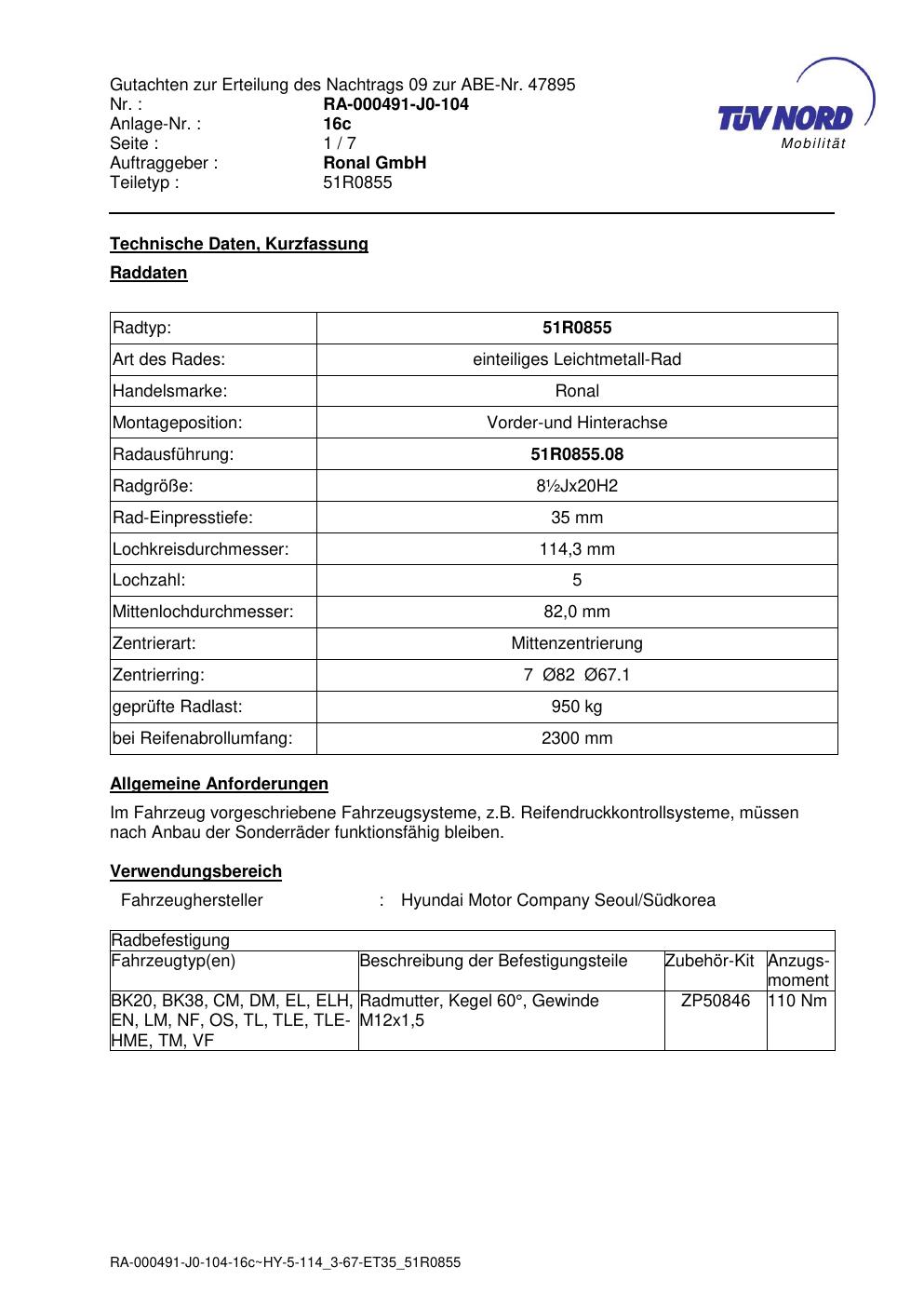 Dieses Gutachten (abe) bezieht sich auf die Alufelge Ronal 51R0855 in der Ausführung ET 0, Mittenloch 0 mm (KBA 47895). Im PDF findest du typischerweise zulässige Reifengrößen, Auflagen/Anbauhinweise und – je nach Dokument – Hinweise zur Eintragung.