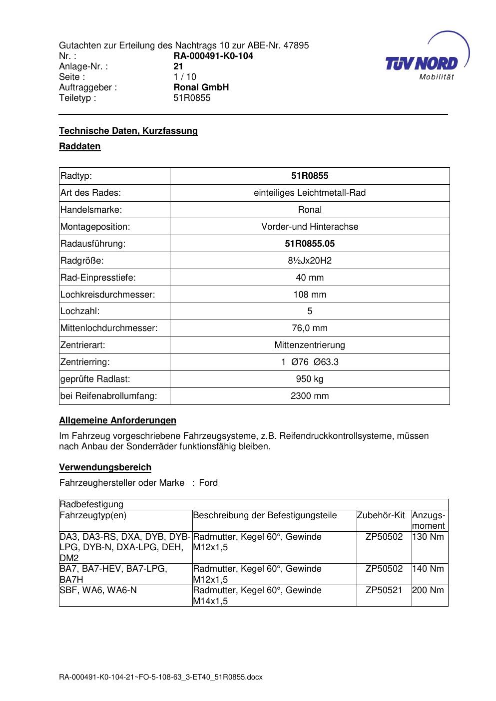 Dieses Gutachten (abe) bezieht sich auf die Alufelge Ronal 51R0855 in der Ausführung ET 0, Mittenloch 0 mm (KBA 47895). Im PDF findest du typischerweise zulässige Reifengrößen, Auflagen/Anbauhinweise und – je nach Dokument – Hinweise zur Eintragung.