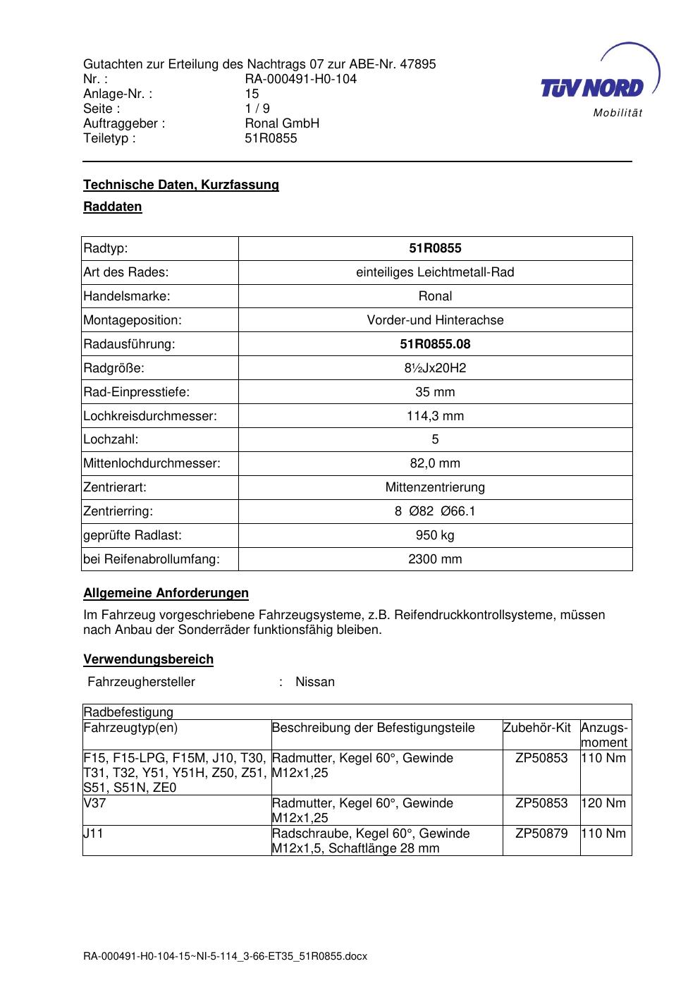 Dieses Gutachten (abe) bezieht sich auf die Alufelge Ronal 51R0855 in der Ausführung ET 0, Mittenloch 0 mm (KBA 47895). Im PDF findest du typischerweise zulässige Reifengrößen, Auflagen/Anbauhinweise und – je nach Dokument – Hinweise zur Eintragung.