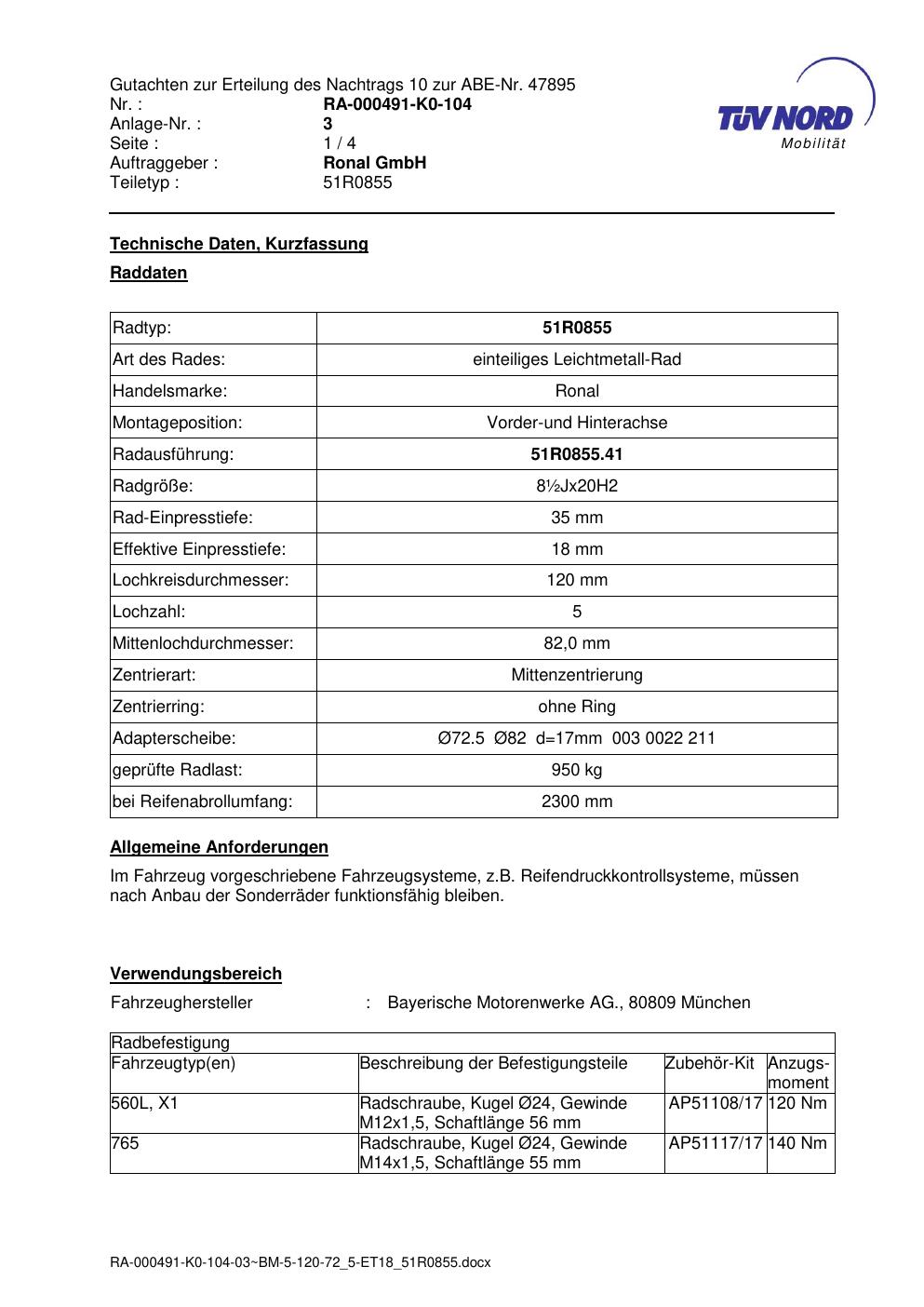 Dieses Gutachten (abe) bezieht sich auf die Alufelge Ronal 51R0855 in der Ausführung ET 0, Mittenloch 0 mm (KBA 47895). Im PDF findest du typischerweise zulässige Reifengrößen, Auflagen/Anbauhinweise und – je nach Dokument – Hinweise zur Eintragung.