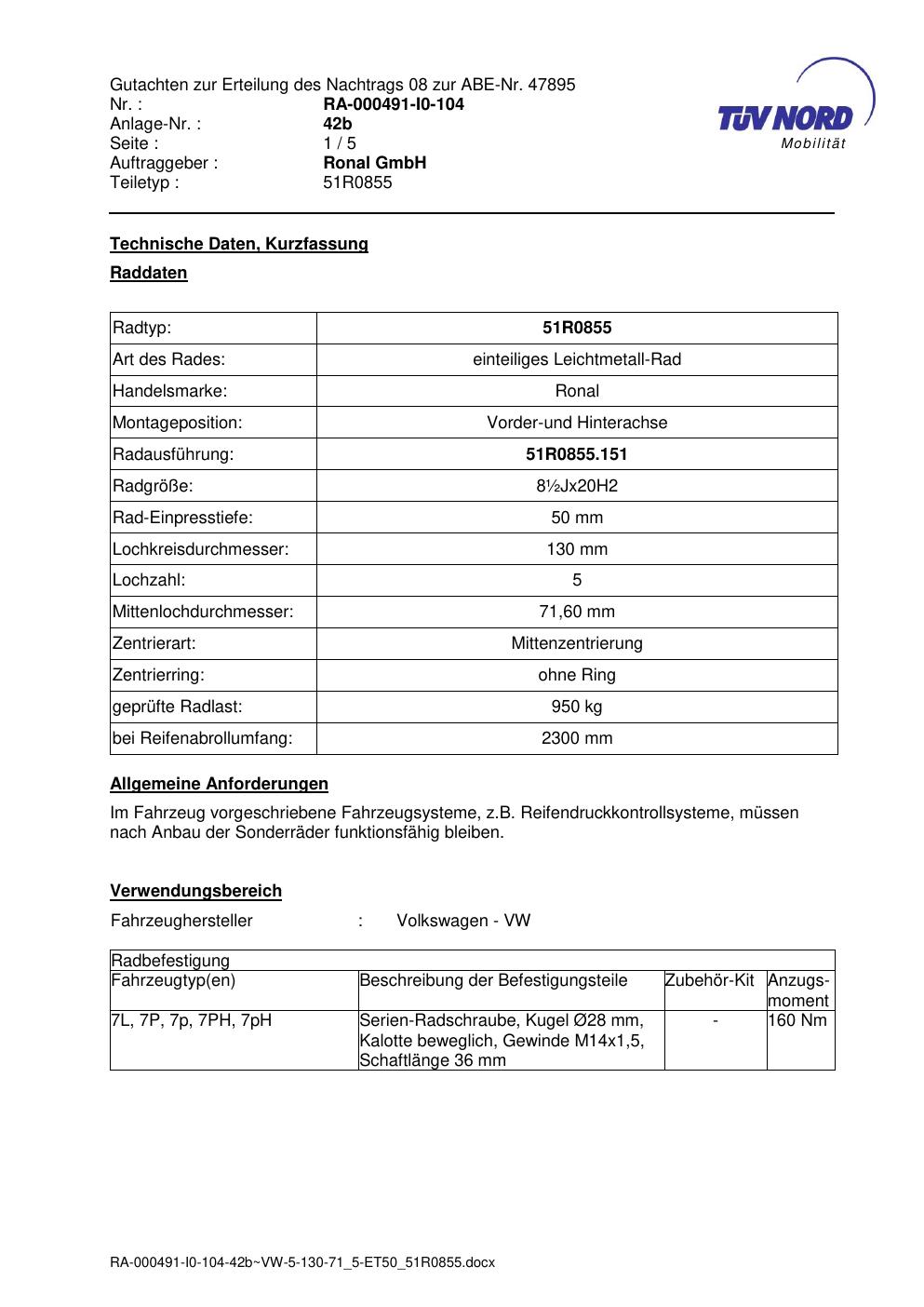 Dieses Gutachten (abe) bezieht sich auf die Alufelge Ronal 51R0855 in der Ausführung 9.5Jx2 ET 0, Mittenloch 0 mm (KBA 47895). Im PDF findest du typischerweise zulässige Reifengrößen, Auflagen/Anbauhinweise und – je nach Dokument – Hinweise zur Eintragung.