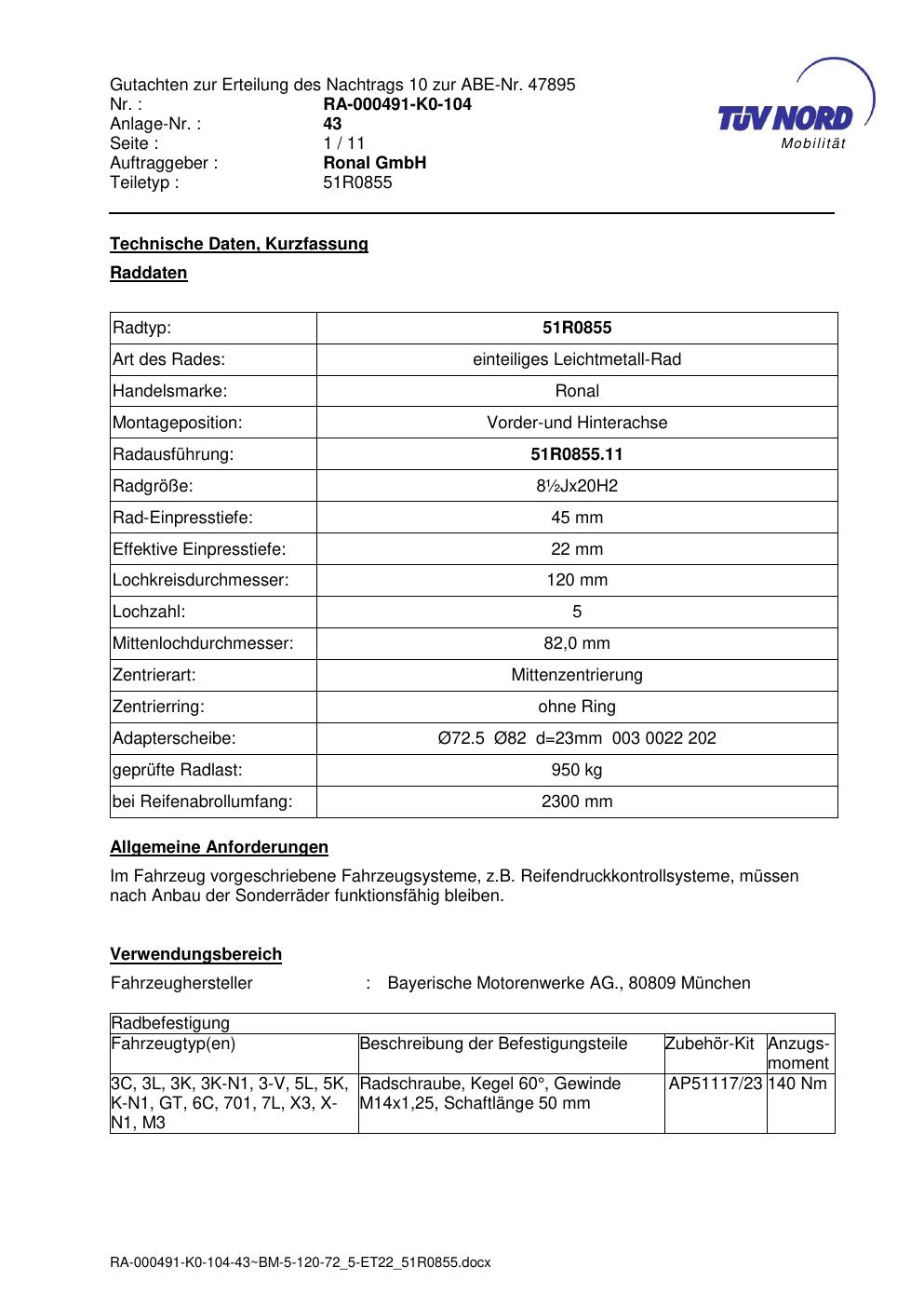 Dieses Gutachten (abe) bezieht sich auf die Alufelge Ronal 51R0855 in der Ausführung ET 0, Mittenloch 0 mm (KBA 47895). Im PDF findest du typischerweise zulässige Reifengrößen, Auflagen/Anbauhinweise und – je nach Dokument – Hinweise zur Eintragung.