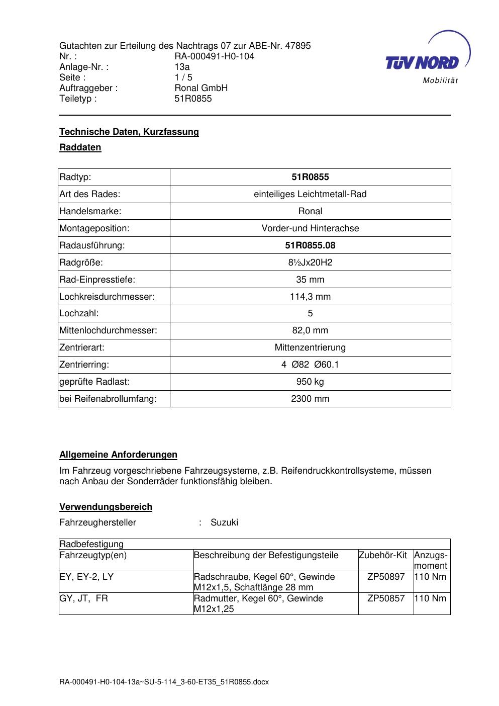 Dieses Gutachten (abe) bezieht sich auf die Alufelge Ronal 51R0855 in der Ausführung ET 0, Mittenloch 0 mm (KBA 47895). Im PDF findest du typischerweise zulässige Reifengrößen, Auflagen/Anbauhinweise und – je nach Dokument – Hinweise zur Eintragung.