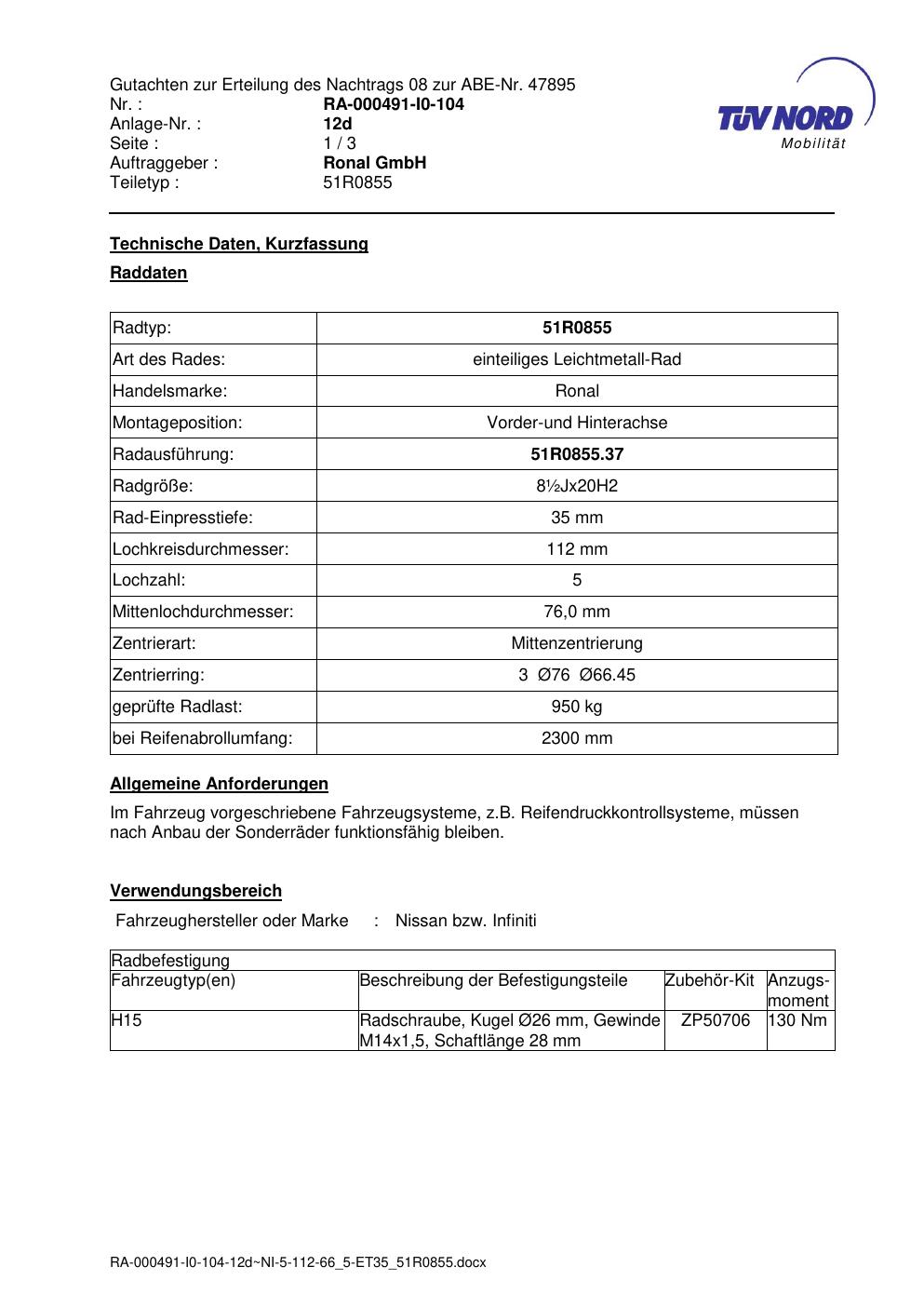 Dieses Gutachten (abe) bezieht sich auf die Alufelge Ronal 51R0855 in der Ausführung ET 0, Mittenloch 0 mm (KBA 47895). Im PDF findest du typischerweise zulässige Reifengrößen, Auflagen/Anbauhinweise und – je nach Dokument – Hinweise zur Eintragung.