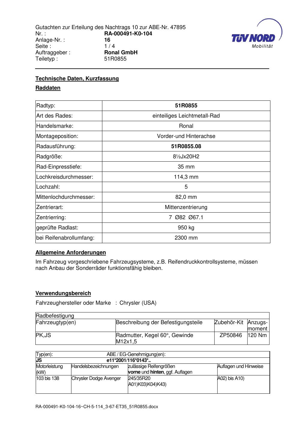 Dieses Gutachten (abe) bezieht sich auf die Alufelge Ronal 51R0855 in der Ausführung ET 0, Mittenloch 0 mm (KBA 47895). Im PDF findest du typischerweise zulässige Reifengrößen, Auflagen/Anbauhinweise und – je nach Dokument – Hinweise zur Eintragung.