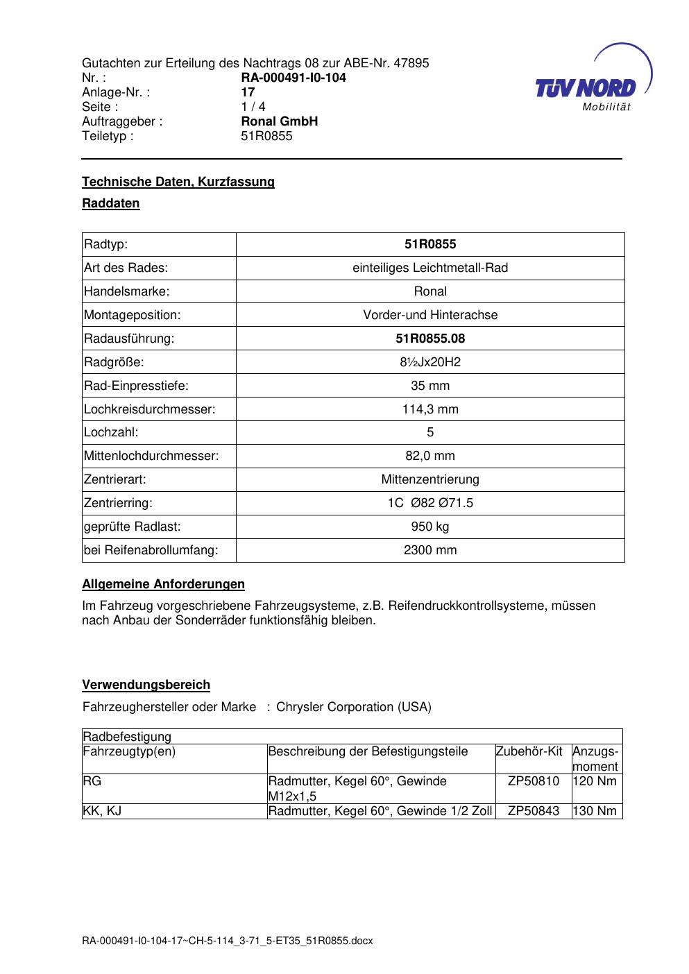 Dieses Gutachten (abe) bezieht sich auf die Alufelge Ronal 51R0855 in der Ausführung ET 0, Mittenloch 0 mm (KBA 47895). Im PDF findest du typischerweise zulässige Reifengrößen, Auflagen/Anbauhinweise und – je nach Dokument – Hinweise zur Eintragung.