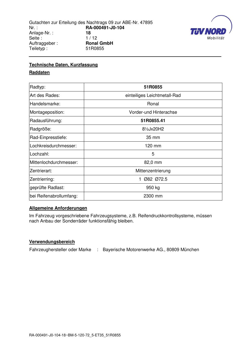 Dieses Gutachten (abe) bezieht sich auf die Alufelge Ronal 51R0855 in der Ausführung ET 0, Mittenloch 0 mm (KBA 47895). Im PDF findest du typischerweise zulässige Reifengrößen, Auflagen/Anbauhinweise und – je nach Dokument – Hinweise zur Eintragung.