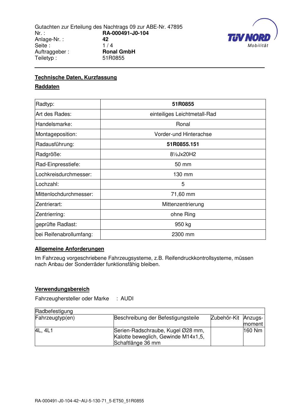 Dieses Gutachten (abe) bezieht sich auf die Alufelge Ronal 51R0855 in der Ausführung ET 0, Mittenloch 0 mm (KBA 47895). Im PDF findest du typischerweise zulässige Reifengrößen, Auflagen/Anbauhinweise und – je nach Dokument – Hinweise zur Eintragung.