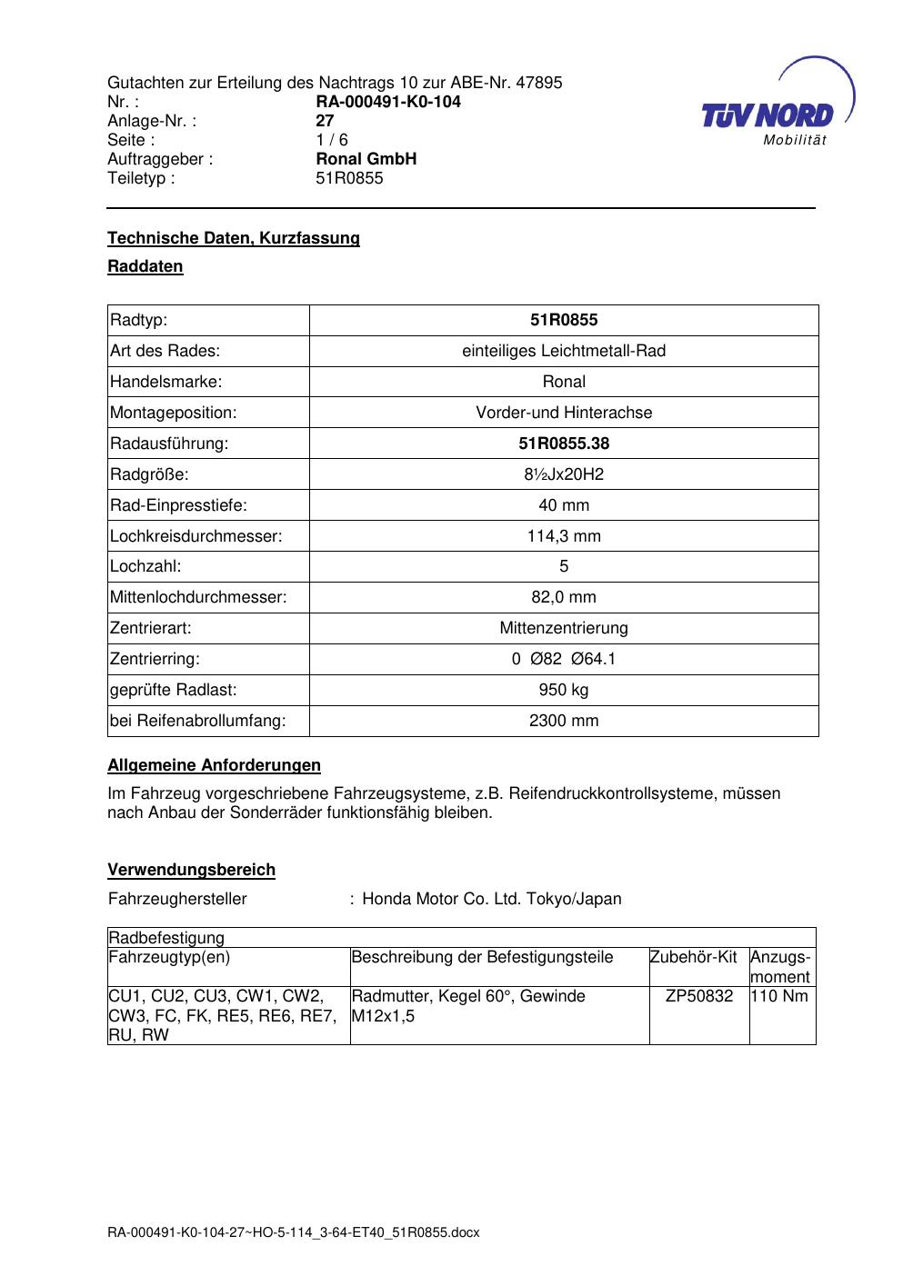 Dieses Gutachten (abe) bezieht sich auf die Alufelge Ronal 51R0855 in der Ausführung ET 0, Mittenloch 0 mm (KBA 47895). Im PDF findest du typischerweise zulässige Reifengrößen, Auflagen/Anbauhinweise und – je nach Dokument – Hinweise zur Eintragung.