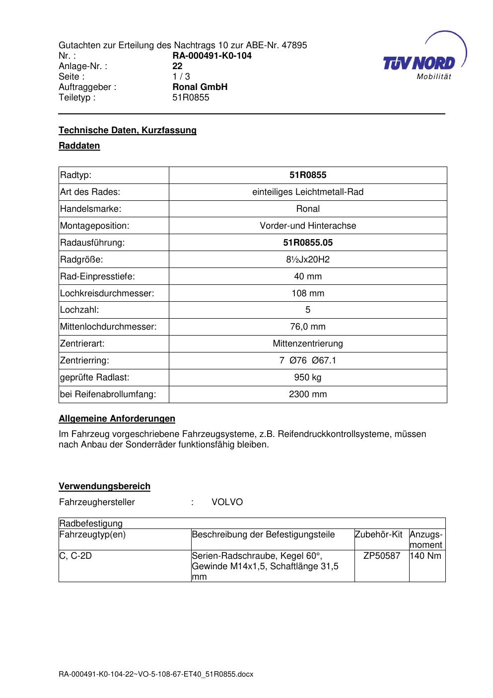 Dieses Gutachten (abe) bezieht sich auf die Alufelge Ronal 51R0855 in der Ausführung ET 0, Mittenloch 0 mm (KBA 47895). Im PDF findest du typischerweise zulässige Reifengrößen, Auflagen/Anbauhinweise und – je nach Dokument – Hinweise zur Eintragung.