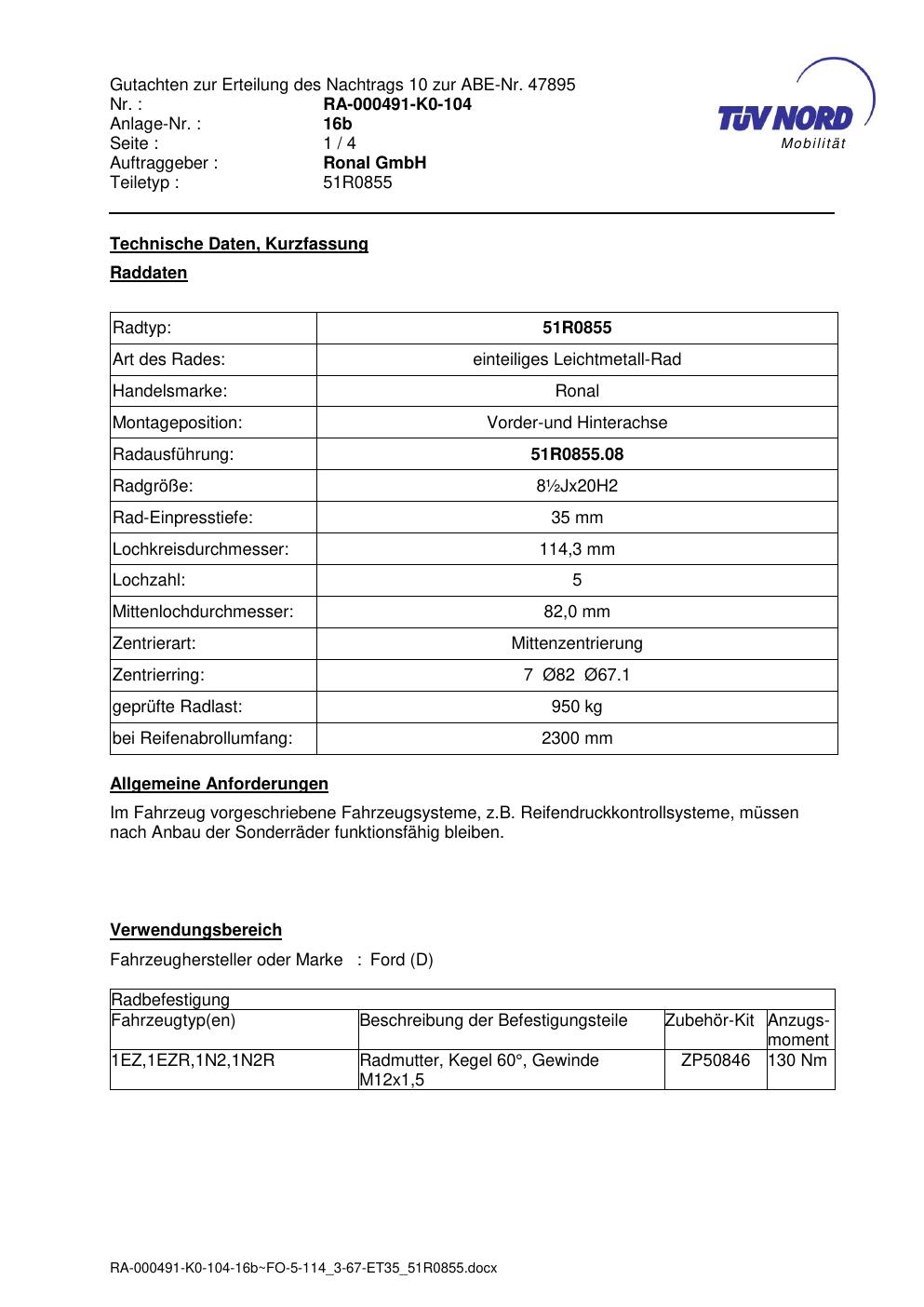 Dieses Gutachten (abe) bezieht sich auf die Alufelge Ronal 51R0855 in der Ausführung ET 0, Mittenloch 0 mm (KBA 47895). Im PDF findest du typischerweise zulässige Reifengrößen, Auflagen/Anbauhinweise und – je nach Dokument – Hinweise zur Eintragung.