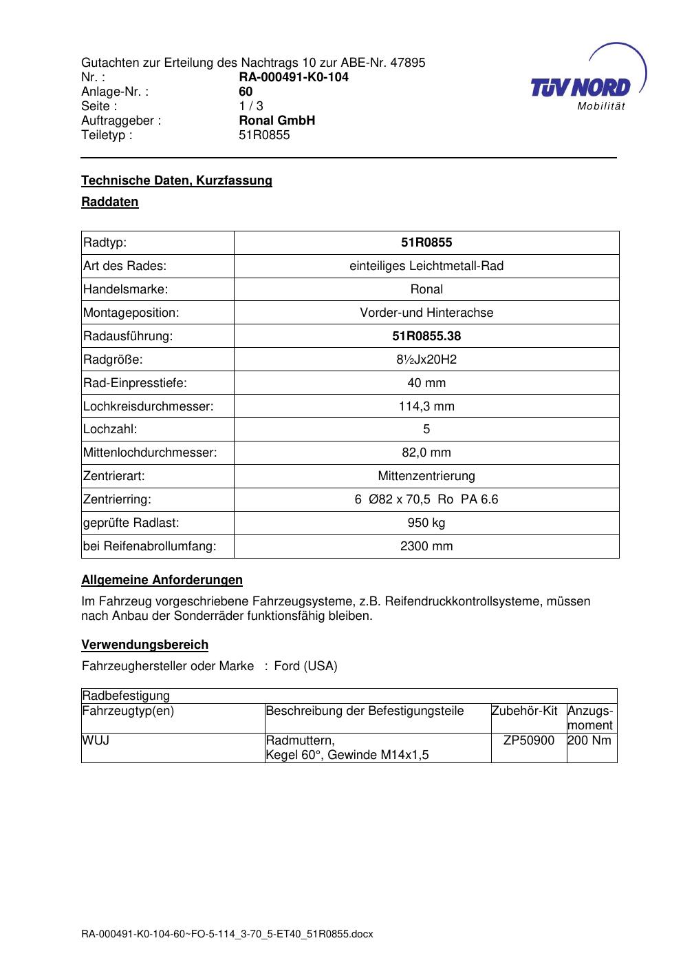 Dieses Gutachten (abe) bezieht sich auf die Alufelge Ronal 51R0855 in der Ausführung ET 0, Mittenloch 0 mm (KBA 47895). Im PDF findest du typischerweise zulässige Reifengrößen, Auflagen/Anbauhinweise und – je nach Dokument – Hinweise zur Eintragung.