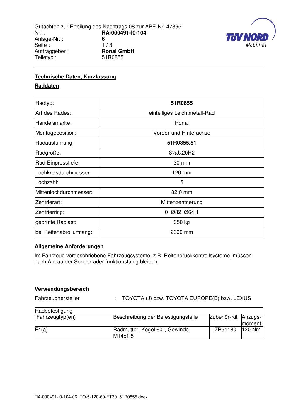 Dieses Gutachten (abe) bezieht sich auf die Alufelge Ronal 51R0855 in der Ausführung ET 0, Mittenloch 0 mm (KBA 47895). Im PDF findest du typischerweise zulässige Reifengrößen, Auflagen/Anbauhinweise und – je nach Dokument – Hinweise zur Eintragung.