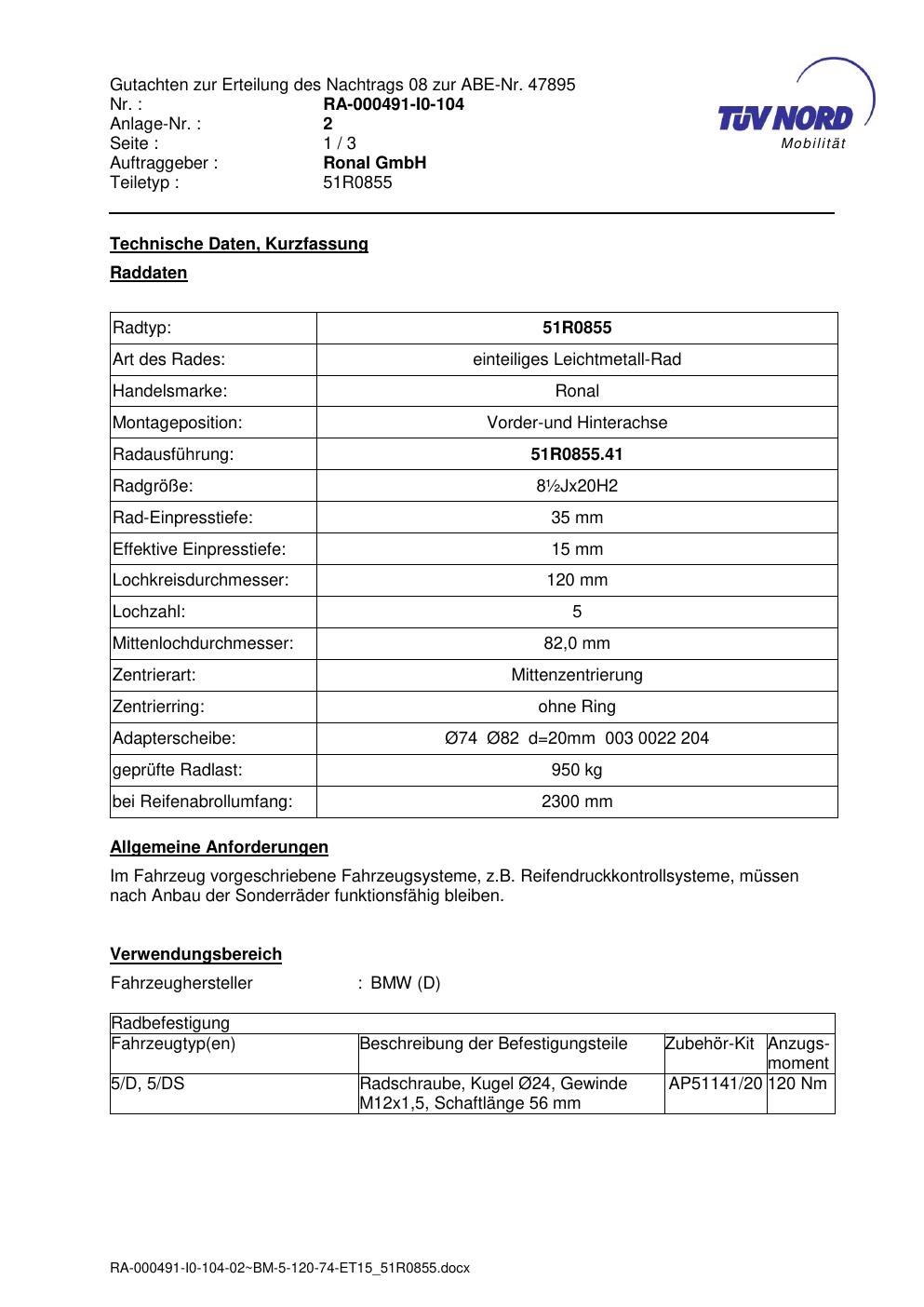 Dieses Gutachten (abe) bezieht sich auf die Alufelge Ronal 51R0855 in der Ausführung ET 0, Mittenloch 0 mm (KBA 47895). Im PDF findest du typischerweise zulässige Reifengrößen, Auflagen/Anbauhinweise und – je nach Dokument – Hinweise zur Eintragung.