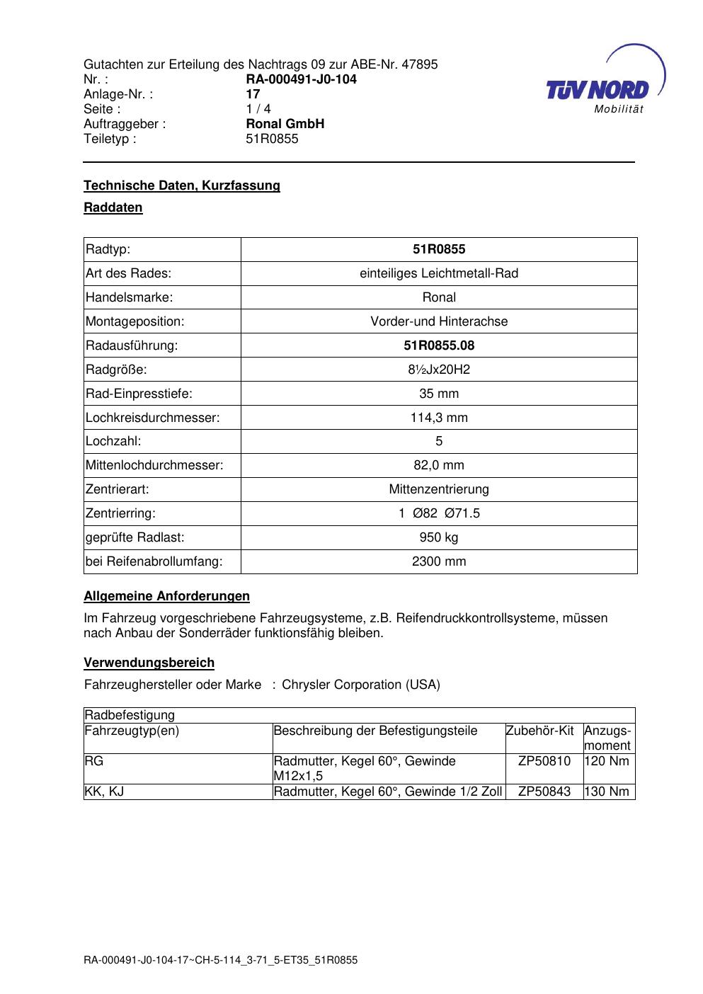 Dieses Gutachten (abe) bezieht sich auf die Alufelge Ronal 51R0855 in der Ausführung ET 0, Mittenloch 0 mm (KBA 47895). Im PDF findest du typischerweise zulässige Reifengrößen, Auflagen/Anbauhinweise und – je nach Dokument – Hinweise zur Eintragung.