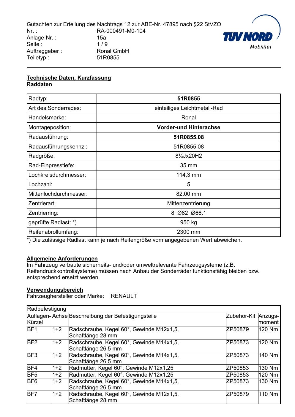 Dieses Gutachten (abe) bezieht sich auf die Alufelge Ronal 51R0855 in der Ausführung ET 0, Mittenloch 0 mm (KBA 47895). Im PDF findest du typischerweise zulässige Reifengrößen, Auflagen/Anbauhinweise und – je nach Dokument – Hinweise zur Eintragung.