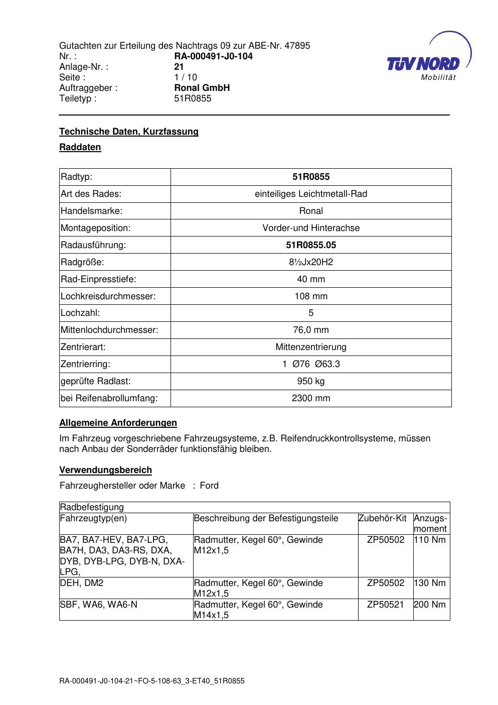 Dieses Gutachten (abe) bezieht sich auf die Alufelge Ronal 51R0855 in der Ausführung ET 0, Mittenloch 0 mm (KBA 47895). Im PDF findest du typischerweise zulässige Reifengrößen, Auflagen/Anbauhinweise und – je nach Dokument – Hinweise zur Eintragung.