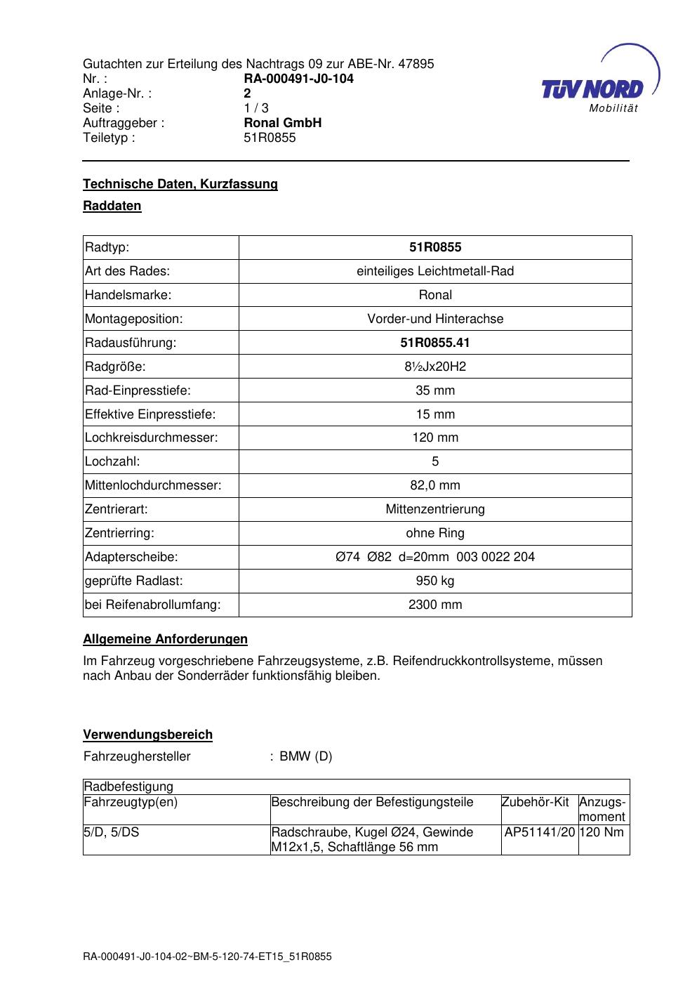 Dieses Gutachten (abe) bezieht sich auf die Alufelge Ronal 51R0855 in der Ausführung ET 0, Mittenloch 0 mm (KBA 47895). Im PDF findest du typischerweise zulässige Reifengrößen, Auflagen/Anbauhinweise und – je nach Dokument – Hinweise zur Eintragung.