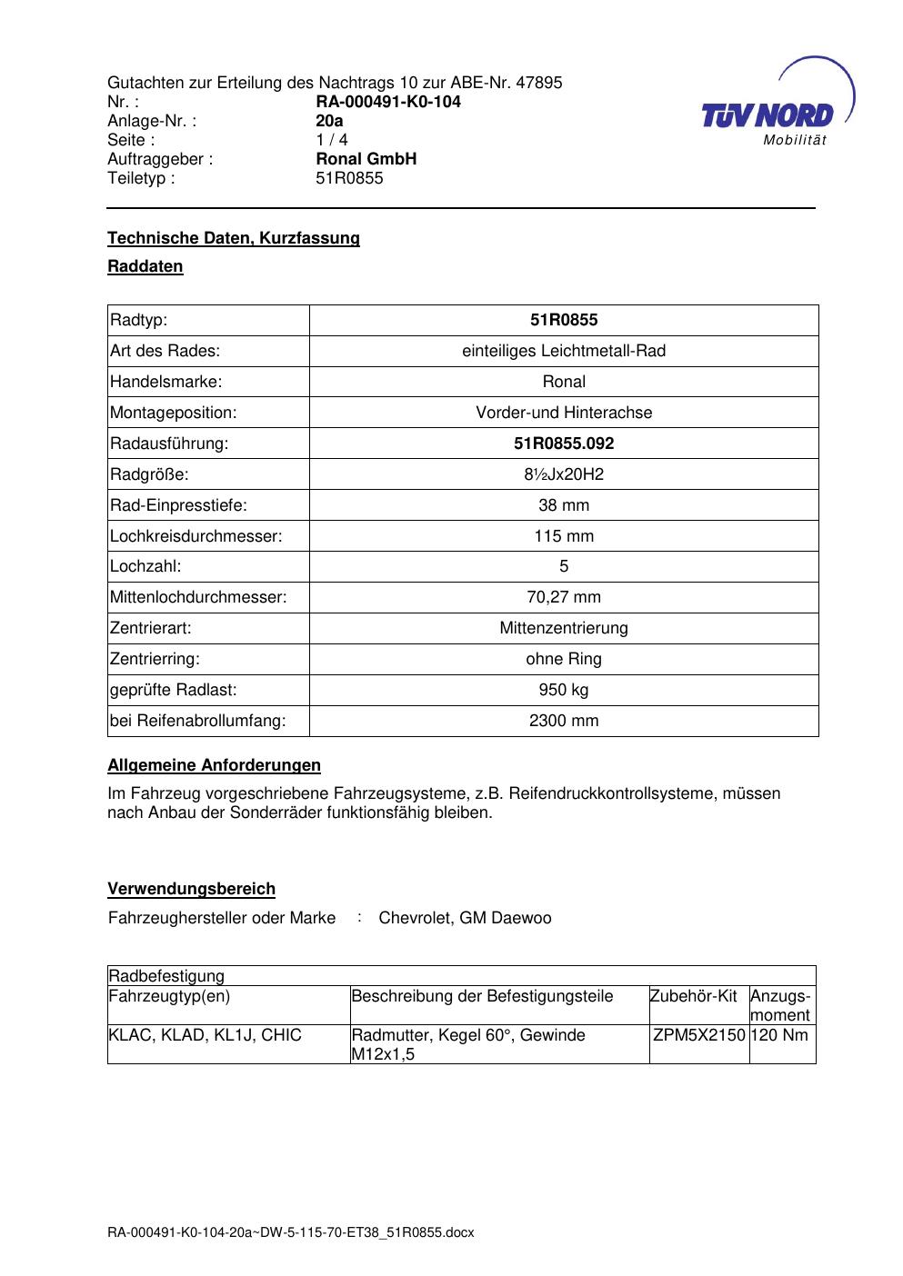 Dieses Gutachten (abe) bezieht sich auf die Alufelge Ronal 51R0855 in der Ausführung ET 0, Mittenloch 0 mm (KBA 47895). Im PDF findest du typischerweise zulässige Reifengrößen, Auflagen/Anbauhinweise und – je nach Dokument – Hinweise zur Eintragung.