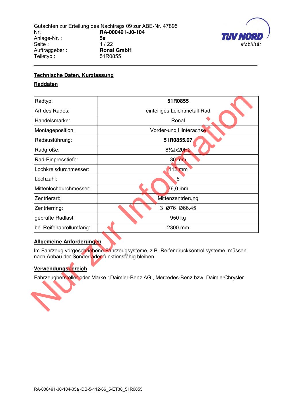 Dieses Gutachten (abe) bezieht sich auf die Alufelge Ronal 51R0855 in der Ausführung ET 0, Mittenloch 0 mm (KBA 47895). Im PDF findest du typischerweise zulässige Reifengrößen, Auflagen/Anbauhinweise und – je nach Dokument – Hinweise zur Eintragung.