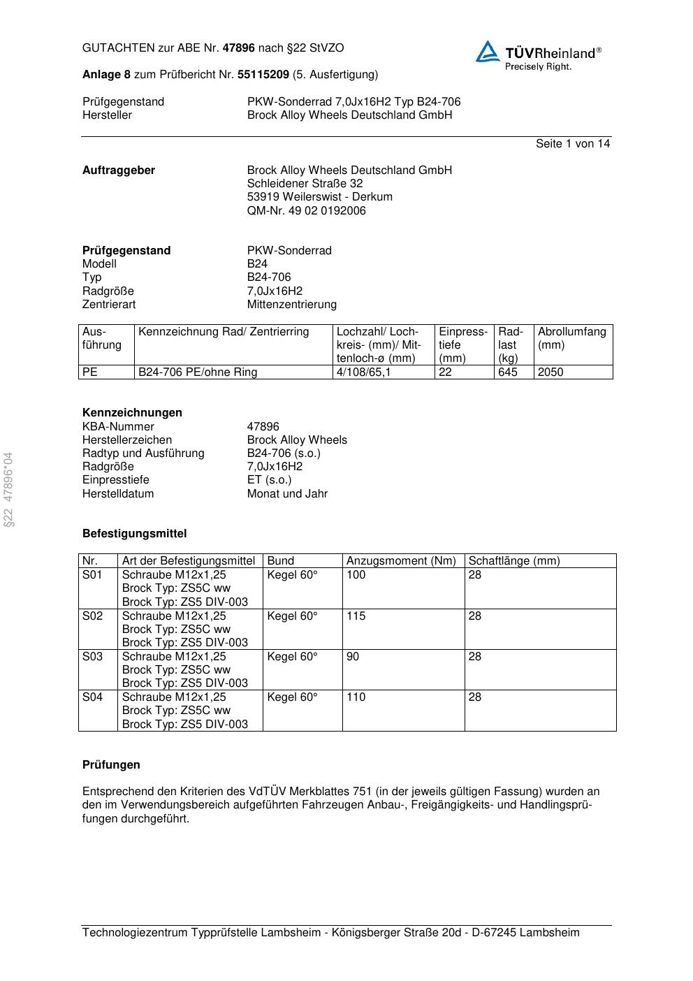 Dieses Gutachten (abe) bezieht sich auf die Alufelge Brock B24-706 in der Ausführung 7Jx16 ET 0, Mittenloch 0 mm (KBA 47896). Im PDF findest du typischerweise zulässige Reifengrößen, Auflagen/Anbauhinweise und – je nach Dokument – Hinweise zur Eintragung.
