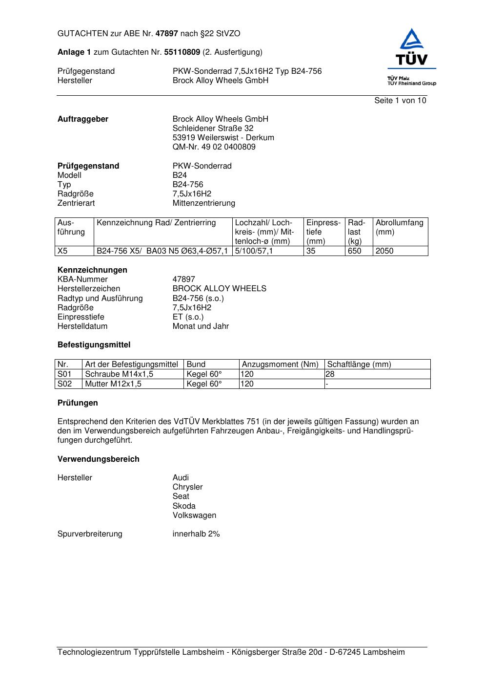 Dieses Gutachten (abe) bezieht sich auf die Alufelge Brock B24-756 in der Ausführung 7.5Jx16 ET 0, Mittenloch 0 mm (KBA 47897). Im PDF findest du typischerweise zulässige Reifengrößen, Auflagen/Anbauhinweise und – je nach Dokument – Hinweise zur Eintragung.