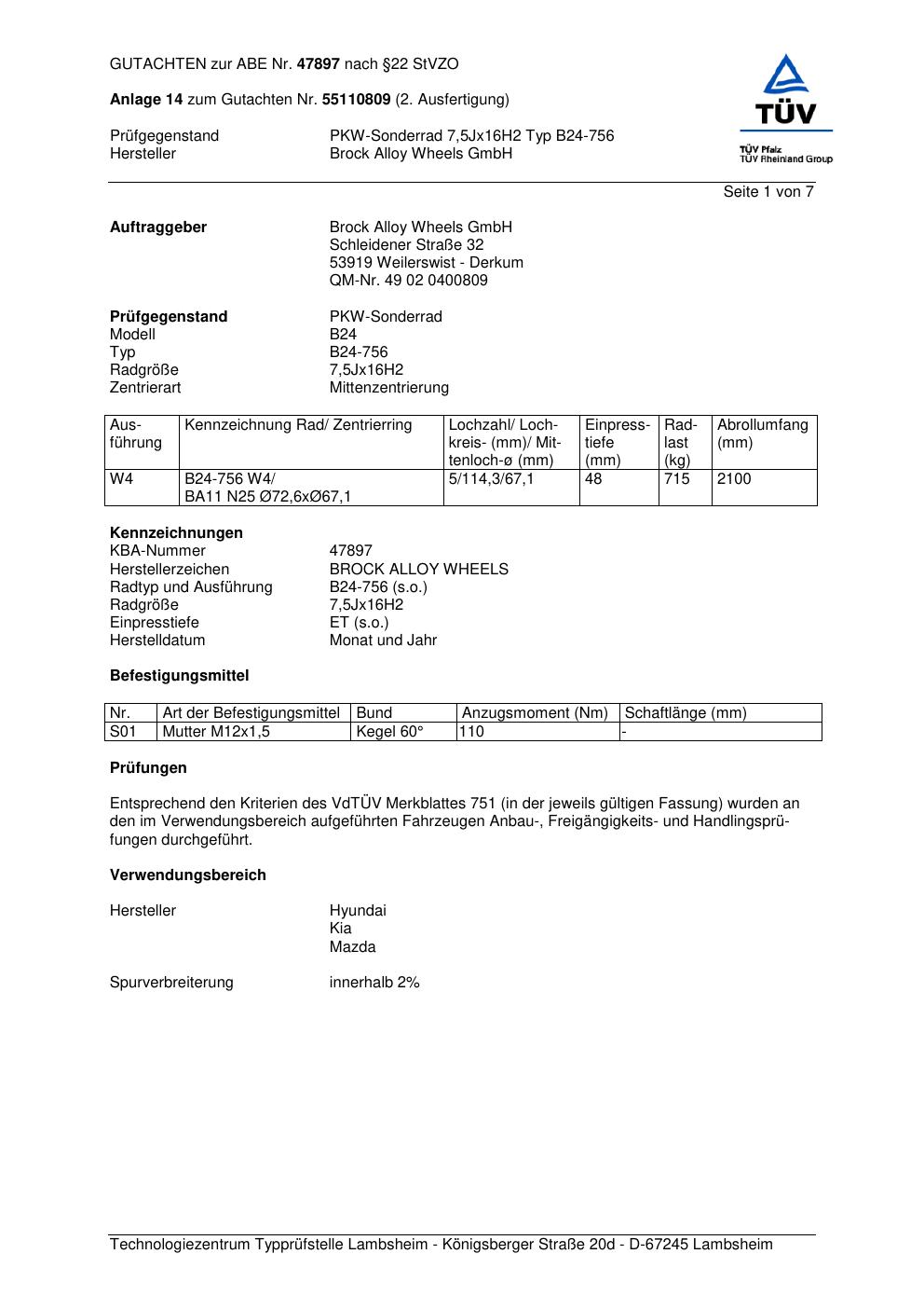 Dieses Gutachten (abe) bezieht sich auf die Alufelge Brock B24-756 in der Ausführung 7.5Jx16 ET 0, Mittenloch 0 mm (KBA 47897). Im PDF findest du typischerweise zulässige Reifengrößen, Auflagen/Anbauhinweise und – je nach Dokument – Hinweise zur Eintragung.