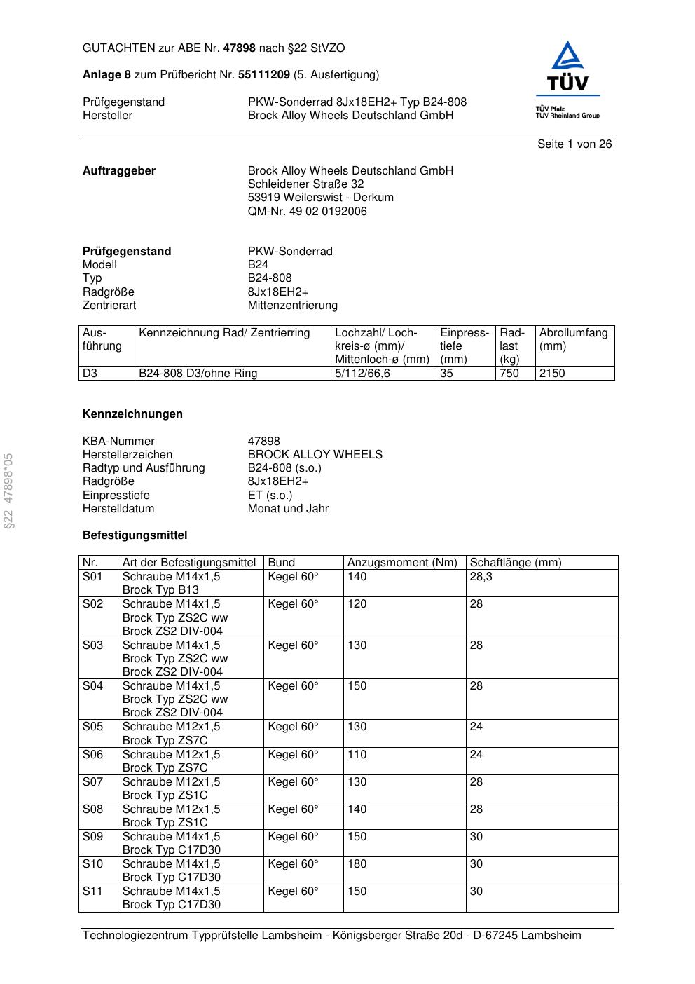 Dieses Gutachten (abe) bezieht sich auf die Alufelge Brock B24-808 in der Ausführung ET 0, Mittenloch 0 mm (KBA 47898). Im PDF findest du typischerweise zulässige Reifengrößen, Auflagen/Anbauhinweise und – je nach Dokument – Hinweise zur Eintragung.