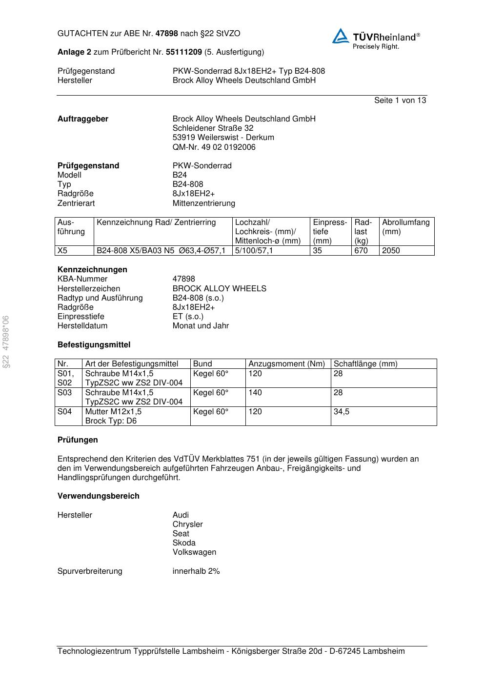 Dieses Gutachten (abe) bezieht sich auf die Alufelge Brock B24-808 in der Ausführung ET 0, Mittenloch 0 mm (KBA 47898). Im PDF findest du typischerweise zulässige Reifengrößen, Auflagen/Anbauhinweise und – je nach Dokument – Hinweise zur Eintragung.