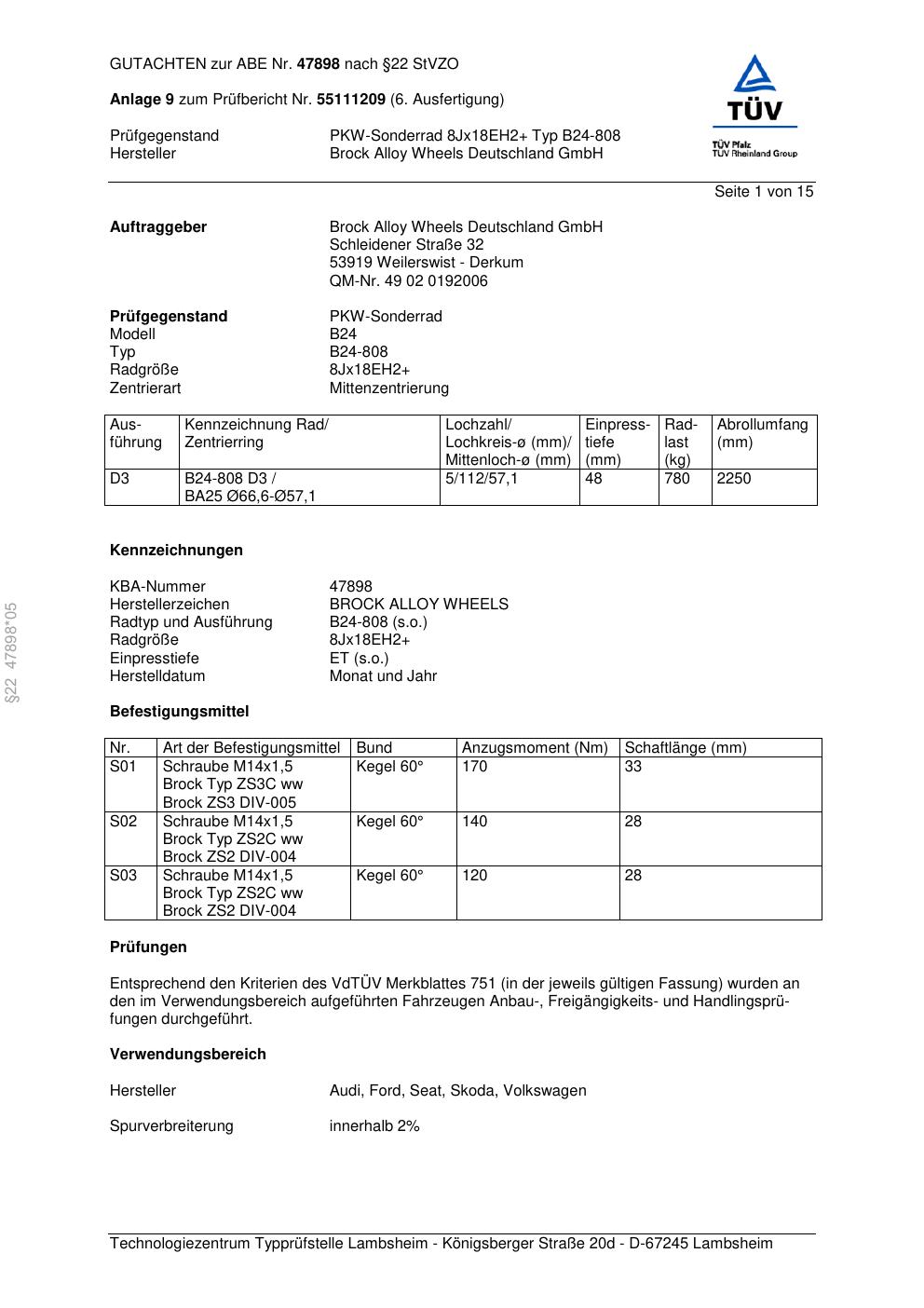 Dieses Gutachten (abe) bezieht sich auf die Alufelge Brock B24-808 in der Ausführung ET 0, Mittenloch 0 mm (KBA 47898). Im PDF findest du typischerweise zulässige Reifengrößen, Auflagen/Anbauhinweise und – je nach Dokument – Hinweise zur Eintragung.
