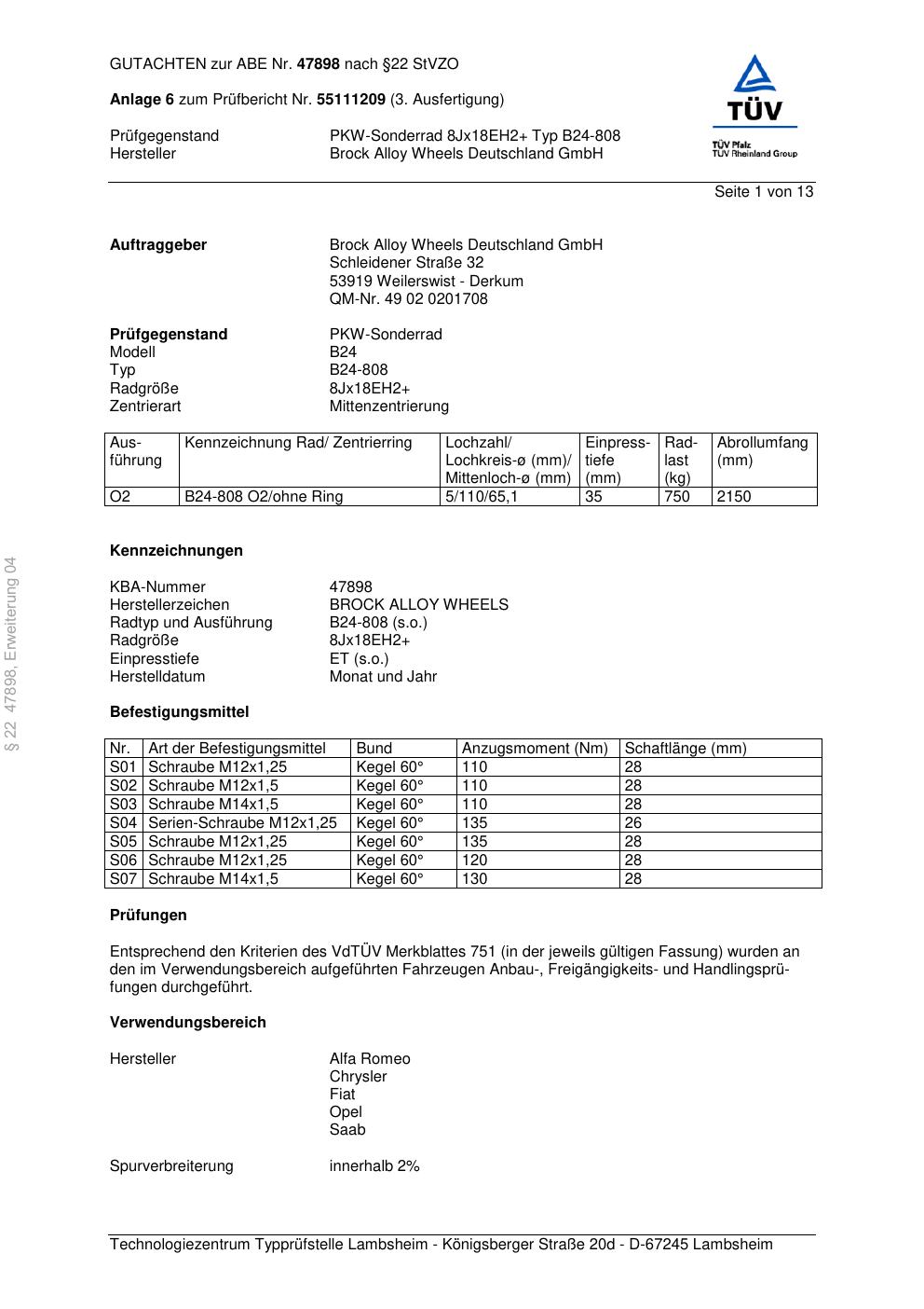 Dieses Gutachten (abe) bezieht sich auf die Alufelge Brock B24-808 in der Ausführung ET 0, Mittenloch 0 mm (KBA 47898). Im PDF findest du typischerweise zulässige Reifengrößen, Auflagen/Anbauhinweise und – je nach Dokument – Hinweise zur Eintragung.