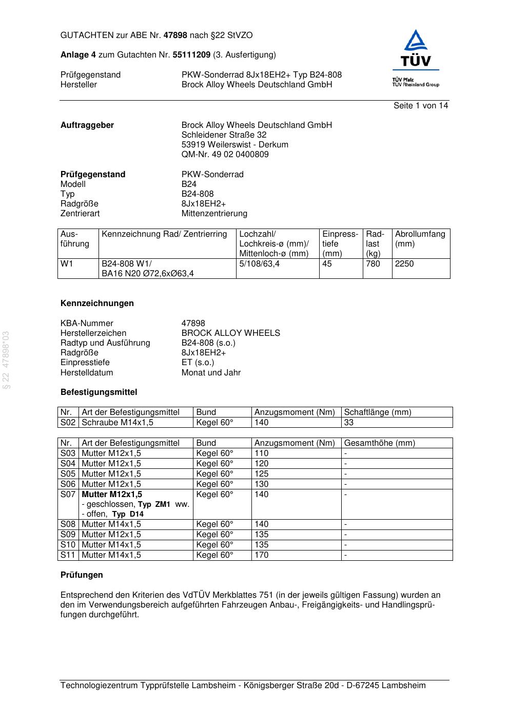 Dieses Gutachten (abe) bezieht sich auf die Alufelge Brock B24-808 in der Ausführung ET 0, Mittenloch 0 mm (KBA 47898). Im PDF findest du typischerweise zulässige Reifengrößen, Auflagen/Anbauhinweise und – je nach Dokument – Hinweise zur Eintragung.