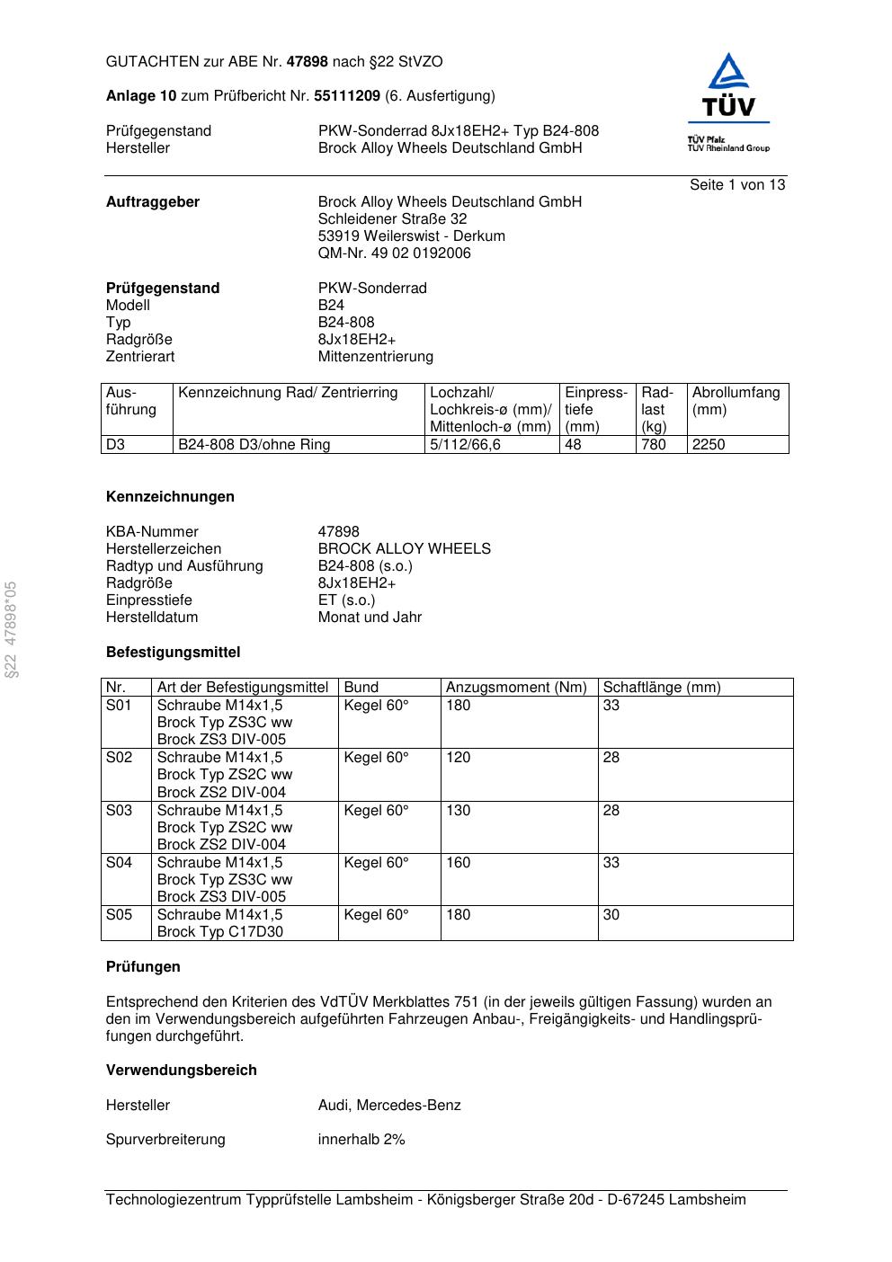 Dieses Gutachten (abe) bezieht sich auf die Alufelge Brock B24-808 in der Ausführung ET 0, Mittenloch 0 mm (KBA 47898). Im PDF findest du typischerweise zulässige Reifengrößen, Auflagen/Anbauhinweise und – je nach Dokument – Hinweise zur Eintragung.