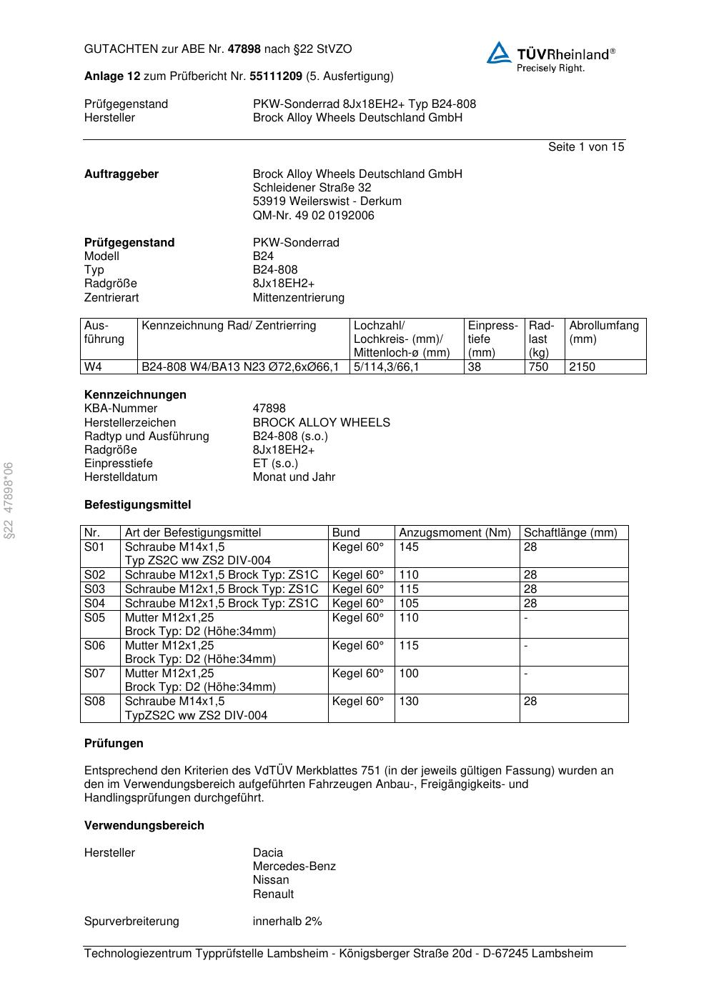Dieses Gutachten (abe) bezieht sich auf die Alufelge Brock B24-808 in der Ausführung ET 0, Mittenloch 0 mm (KBA 47898). Im PDF findest du typischerweise zulässige Reifengrößen, Auflagen/Anbauhinweise und – je nach Dokument – Hinweise zur Eintragung.