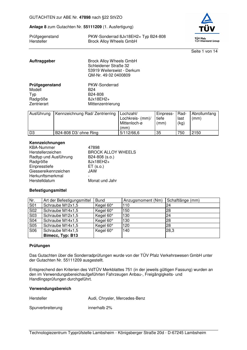 Dieses Gutachten (abe) bezieht sich auf die Alufelge Brock B24-808 in der Ausführung ET 0, Mittenloch 0 mm (KBA 47898). Im PDF findest du typischerweise zulässige Reifengrößen, Auflagen/Anbauhinweise und – je nach Dokument – Hinweise zur Eintragung.