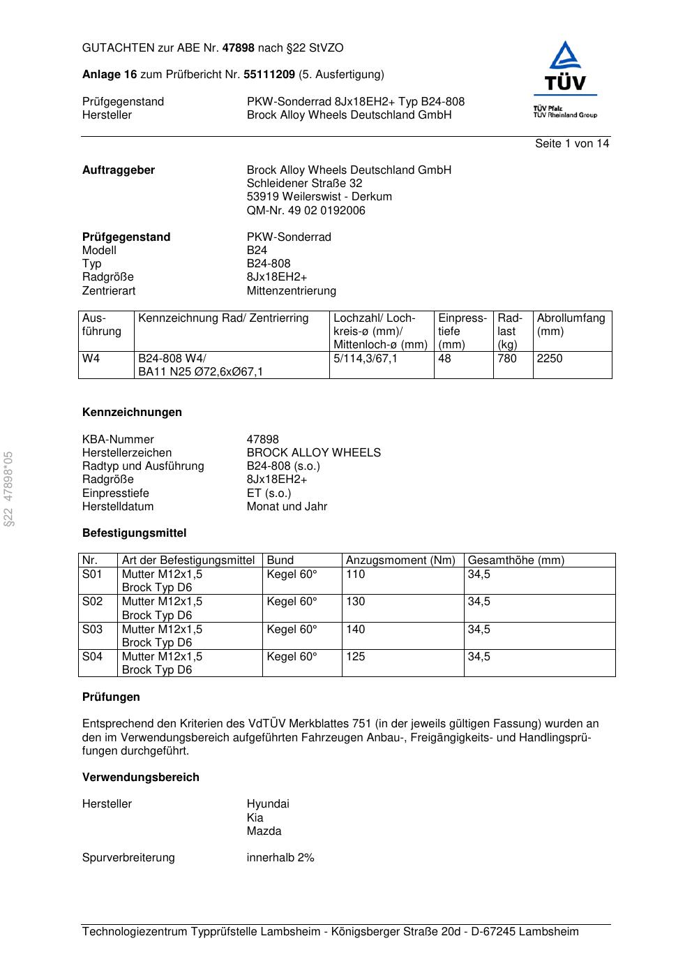 Dieses Gutachten (abe) bezieht sich auf die Alufelge Brock B24-808 in der Ausführung ET 0, Mittenloch 0 mm (KBA 47898). Im PDF findest du typischerweise zulässige Reifengrößen, Auflagen/Anbauhinweise und – je nach Dokument – Hinweise zur Eintragung.