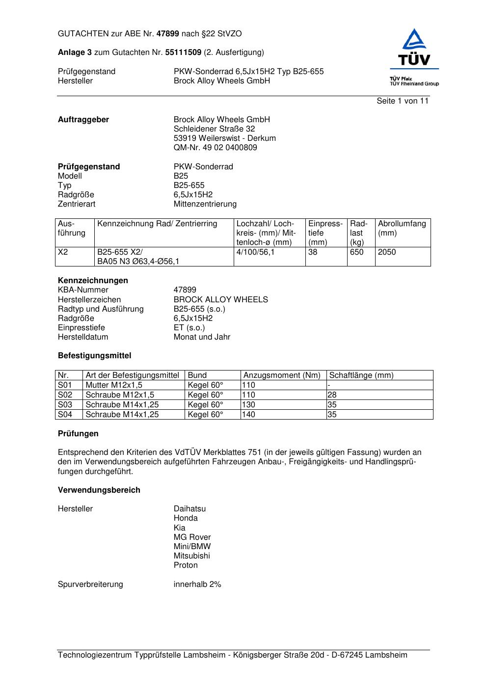 Dieses Gutachten (abe) bezieht sich auf die Alufelge Brock B25-655 in der Ausführung 6.5Jx15 ET 0, Mittenloch 0 mm (KBA 47899). Im PDF findest du typischerweise zulässige Reifengrößen, Auflagen/Anbauhinweise und – je nach Dokument – Hinweise zur Eintragung.