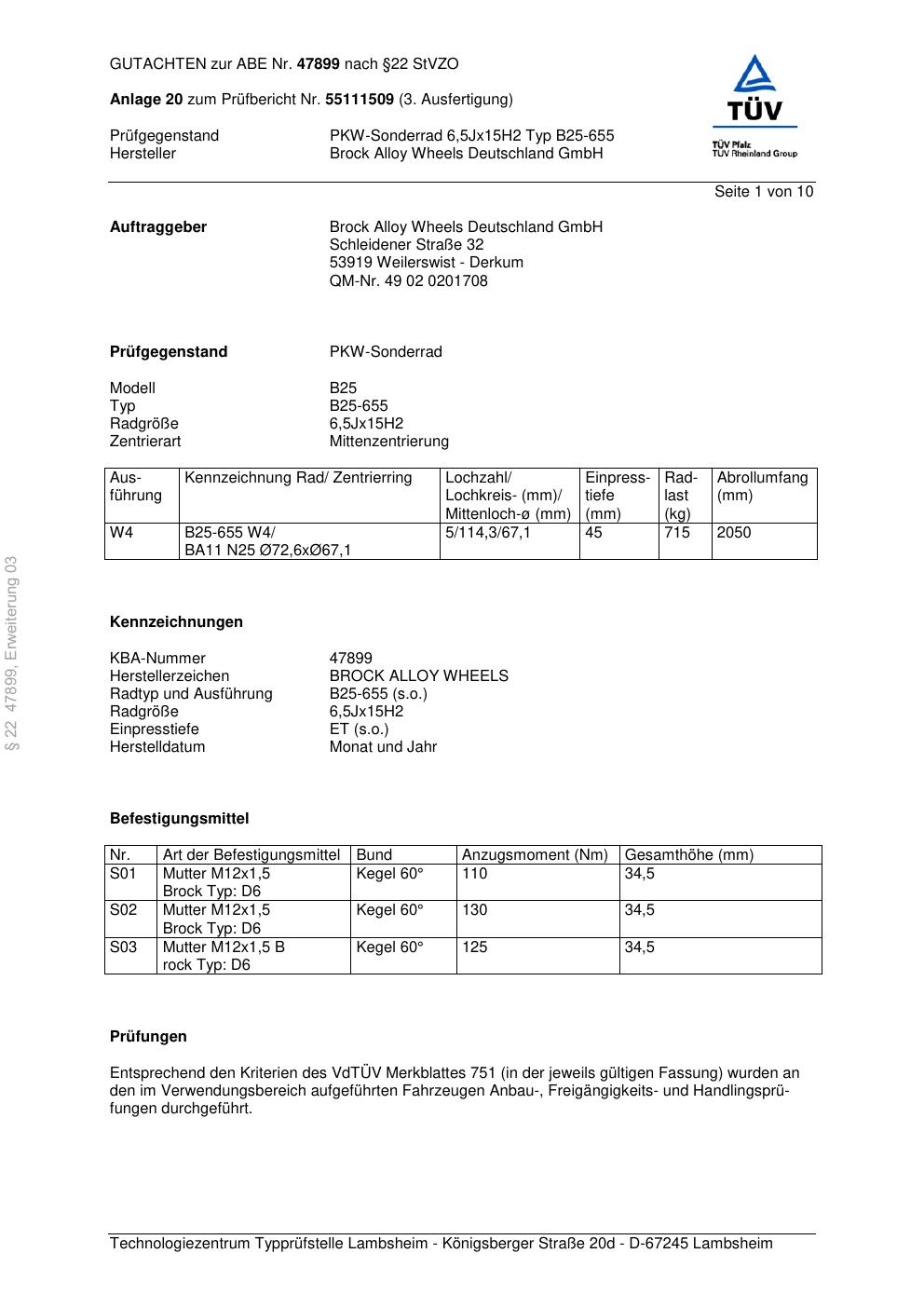 Dieses Gutachten (abe) bezieht sich auf die Alufelge Brock B25-655 in der Ausführung 6.5Jx15 ET 0, Mittenloch 0 mm (KBA 47899). Im PDF findest du typischerweise zulässige Reifengrößen, Auflagen/Anbauhinweise und – je nach Dokument – Hinweise zur Eintragung.