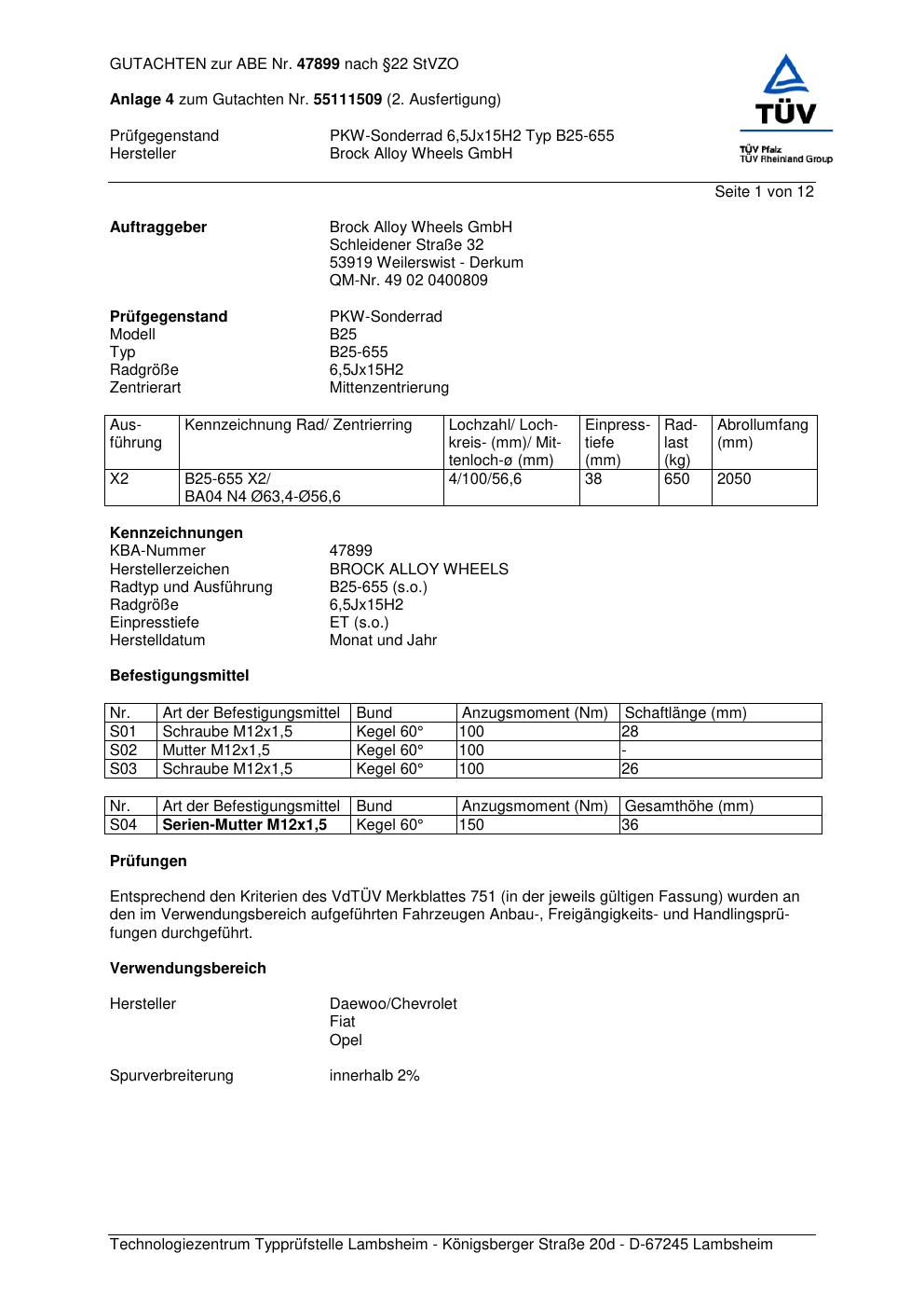 Dieses Gutachten (abe) bezieht sich auf die Alufelge Brock B25-655 in der Ausführung 6.5Jx15 ET 0, Mittenloch 0 mm (KBA 47899). Im PDF findest du typischerweise zulässige Reifengrößen, Auflagen/Anbauhinweise und – je nach Dokument – Hinweise zur Eintragung.