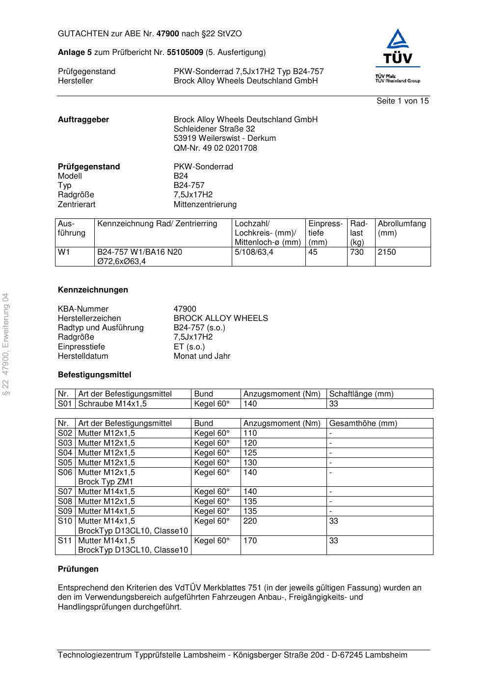 Dieses Gutachten (abe) bezieht sich auf die Alufelge Brock B24-757 in der Ausführung 7.5Jx17 ET 0, Mittenloch 0 mm (KBA 47900). Im PDF findest du typischerweise zulässige Reifengrößen, Auflagen/Anbauhinweise und – je nach Dokument – Hinweise zur Eintragung.